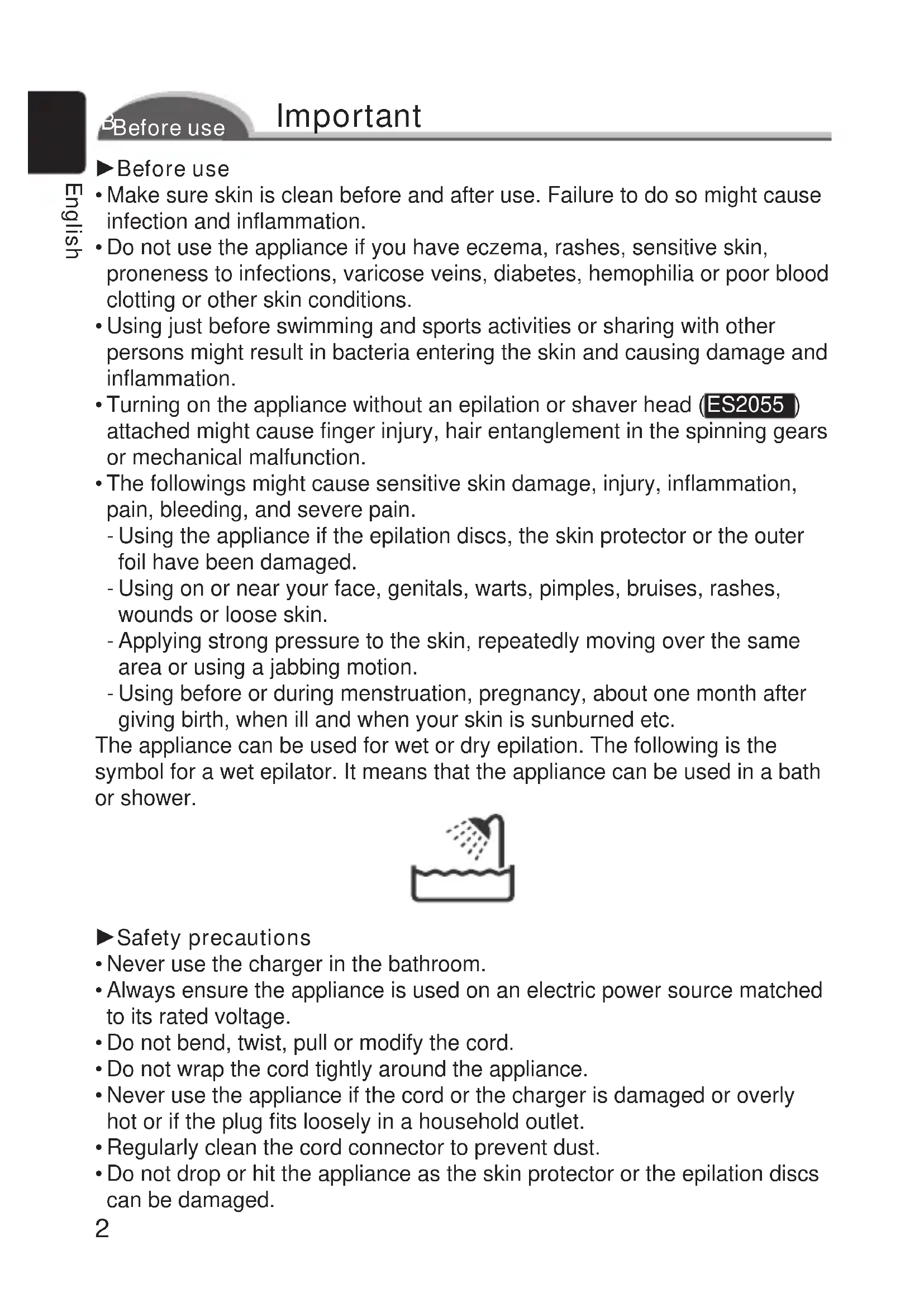 attached might cause finger injury, hair entanglement in the spinning gears or mechanical malfunction. The followings might cause sensitive skin damage, injury, inflammation, pain, bleeding, and severe pain. Using the appliance if the epilation discs, the skin protector or the outer foil have been damaged. Using on or near your face, genitals, warts, pimples, bruises, rashes, wounds or loose skin. Applying strong pressure to the skin, repeatedly moving over the same area or using a jabbing motion. Using before or during menstruation, pregnancy, about one month after giving birth, when ill and when your skin is sunburned etc. The appliance can be used for wet or dry epilation. The following is the symbol for a wet epilator. It means that the appliance can be used in a bath or shower. 1Safety precautions Never use the charger in the bathroom. Always ensure the appliance is used on an electric power source matched to its rated voltage. Do not bend, twist, pull or modify the cord. Do not wrap the cord tightly around the appliance. Never use the appliance if the cord or the charger is damaged or overly hot or if the plug fits loosely in a household outlet. Regularly clean the cord connector to prevent dust. Do not drop or hit the appliance as the skin protector or the epilation discs can be damaged.