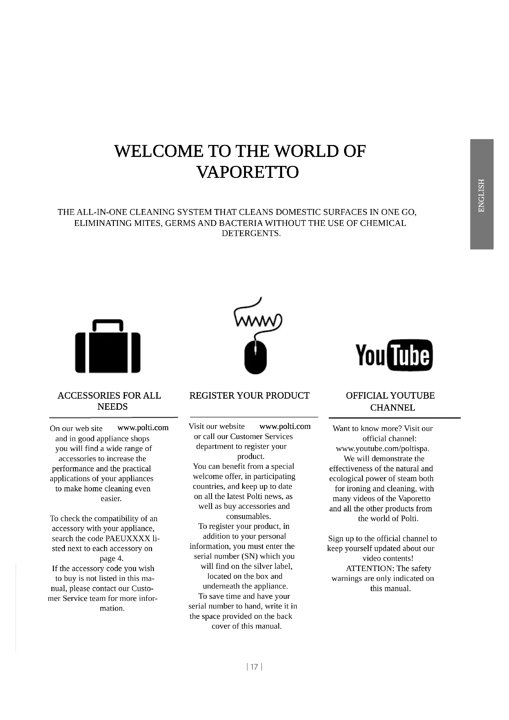 Visit our website www.polti.com or call our Customer Services department to register your product. You can benefit from a special welcome offer, in participating countries, and keep up to date on all the latest Polti news, as well as buy accessories and consumables. To register your product, in addition to your personal information, you must enter the serial number (SN) which you will find on the silver label, located on the box and underneath the appliance. To save time and have your serial number to hand, write it in the space provided on the back cover of this manual. OFFICIAL YOUTUBE CHANNEL Want to know more? Visit our official channel: www.youtube.com/poltispa. We will demonstrate the effectiveness of the natural and ecological power of steam both for ironing and cleaning, with many videos of the Vaporetto and all the other products from the world of Polti. Sign up to the official channel to keep yourself updated about our video contents! ATTENTION: The safety warnings are only indicated on this manual.ENGLISH | 18 | SAFETY WARNINGS