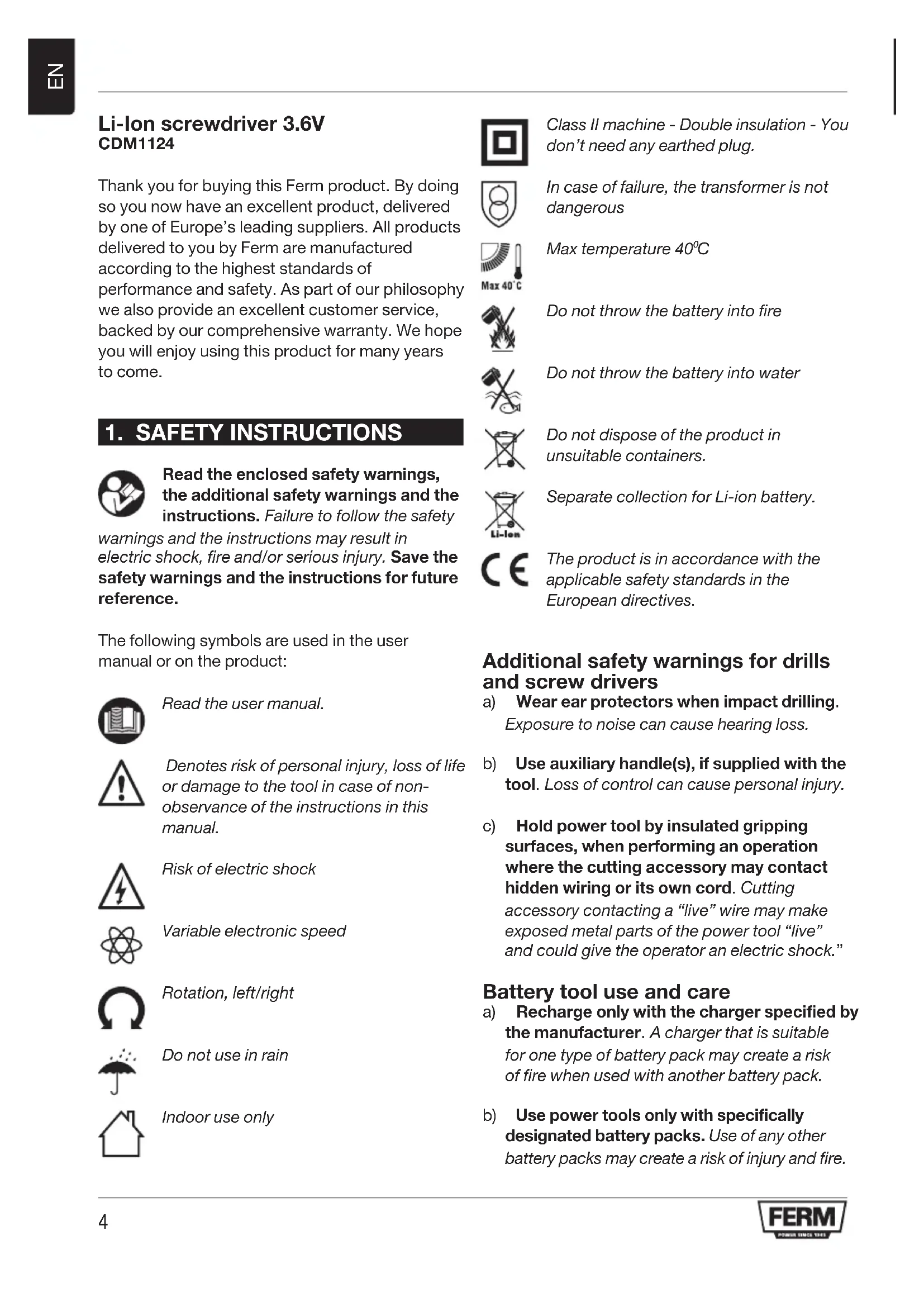 Li-Ion screwdriver 3.6V CDM1124 Thank you for buying this Ferm product. By doing so you now have an excellent product, delivered by one of Europe’s leading suppliers. All products delivered to you by Ferm are manufactured according to the highest standards of performance and safety. As part of our philosophy we also provide an excellent customer service, backed by our comprehensive warranty. We hope you will enjoy using this product for many years to come.