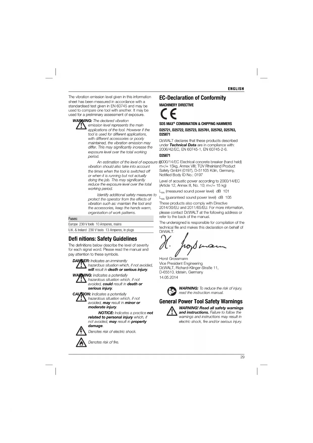 EWALT declares that these products described under Technical Data are in compliance with: 2006/42/EC, EN 60745-1, EN 60745-2-6. D25871 2000/14/EC Electrical concrete breaker (hand held) m</= 15kg, Annex VIII; TÜV Rheinland Product Safety GmbH (0197), D-51105 Köln, Germany, Notified Body ID No.: 0197 Level of acoustic power according to 2000/14/EC (Article 12, Annex III, No. 10; m</= 15 kg)