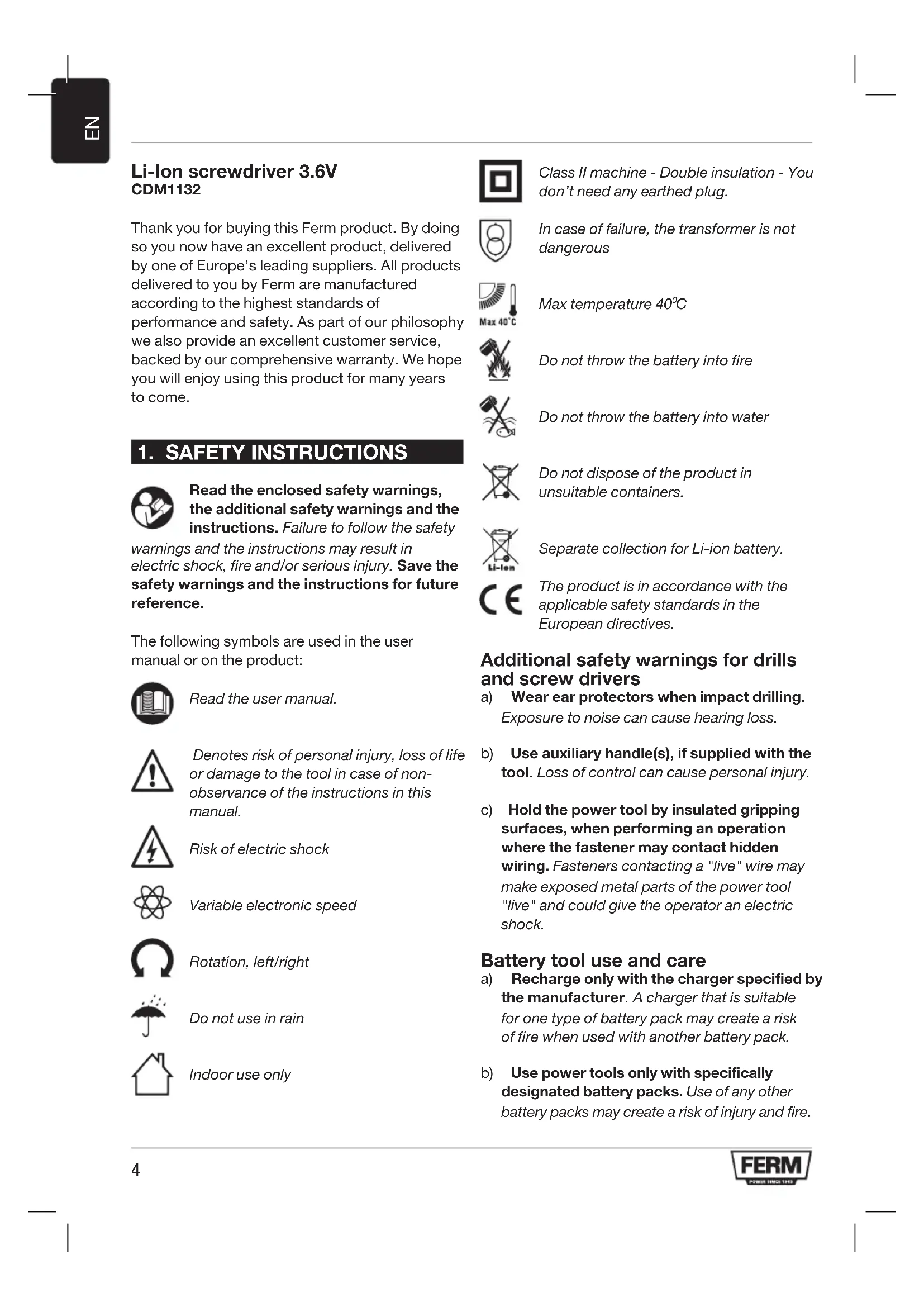 Li-Ion screwdriver 3.6V CDM1132 Thank you for buying this Ferm product. By doing so you now have an excellent product, delivered by one of Europe’s leading suppliers. All products delivered to you by Ferm are manufactured according to the highest standards of performance and safety. As part of our philosophy we also provide an excellent customer service, backed by our comprehensive warranty. We hope you will enjoy using this product for many years to come.