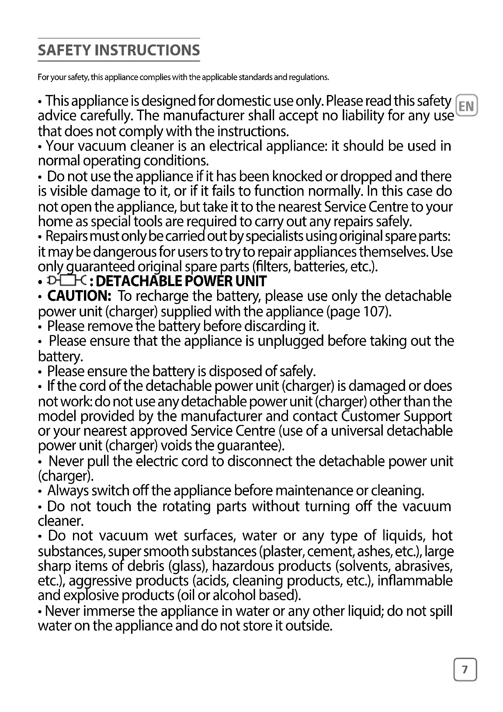 - The plug must be removed from the socket-outlet before cleaning or maintaining the appliance.9 BATTERY SAFETY INSTRUCTIONS* (*depending on the model)