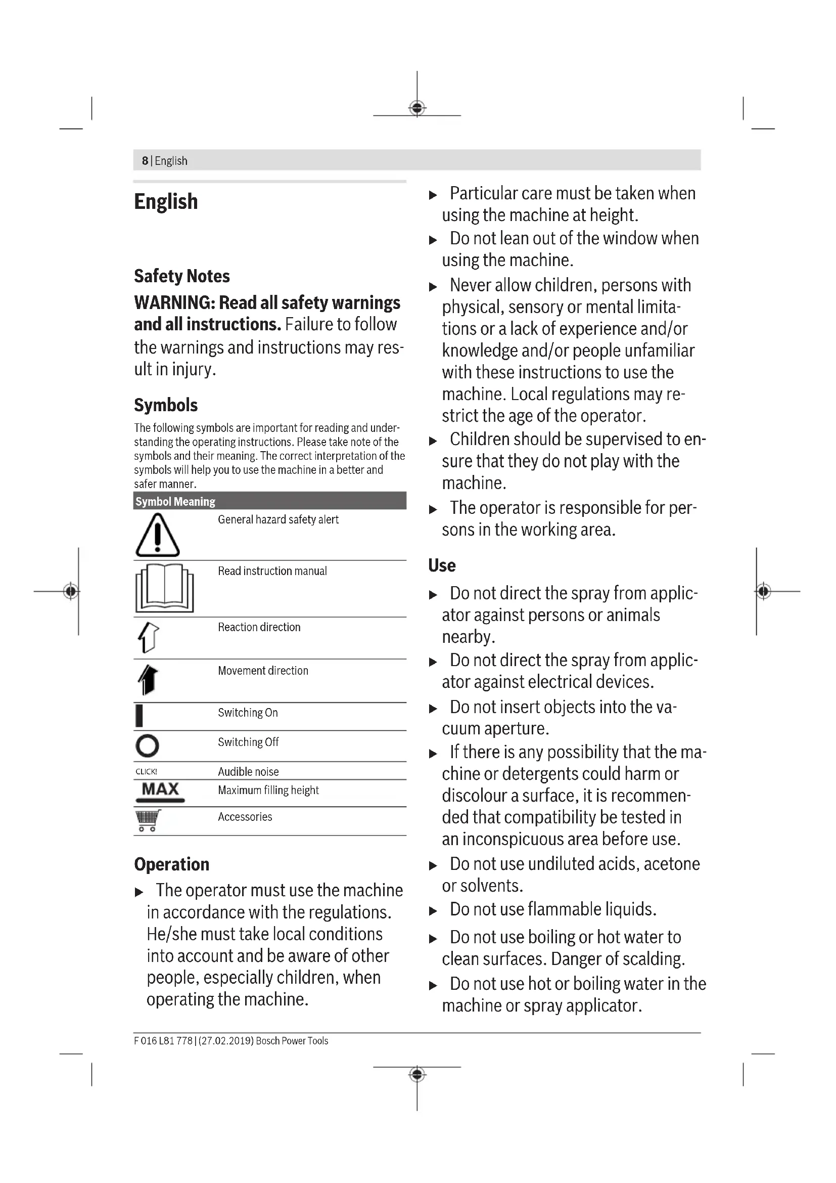 - Do not use hot or boiling water in the machine or spray applicator.