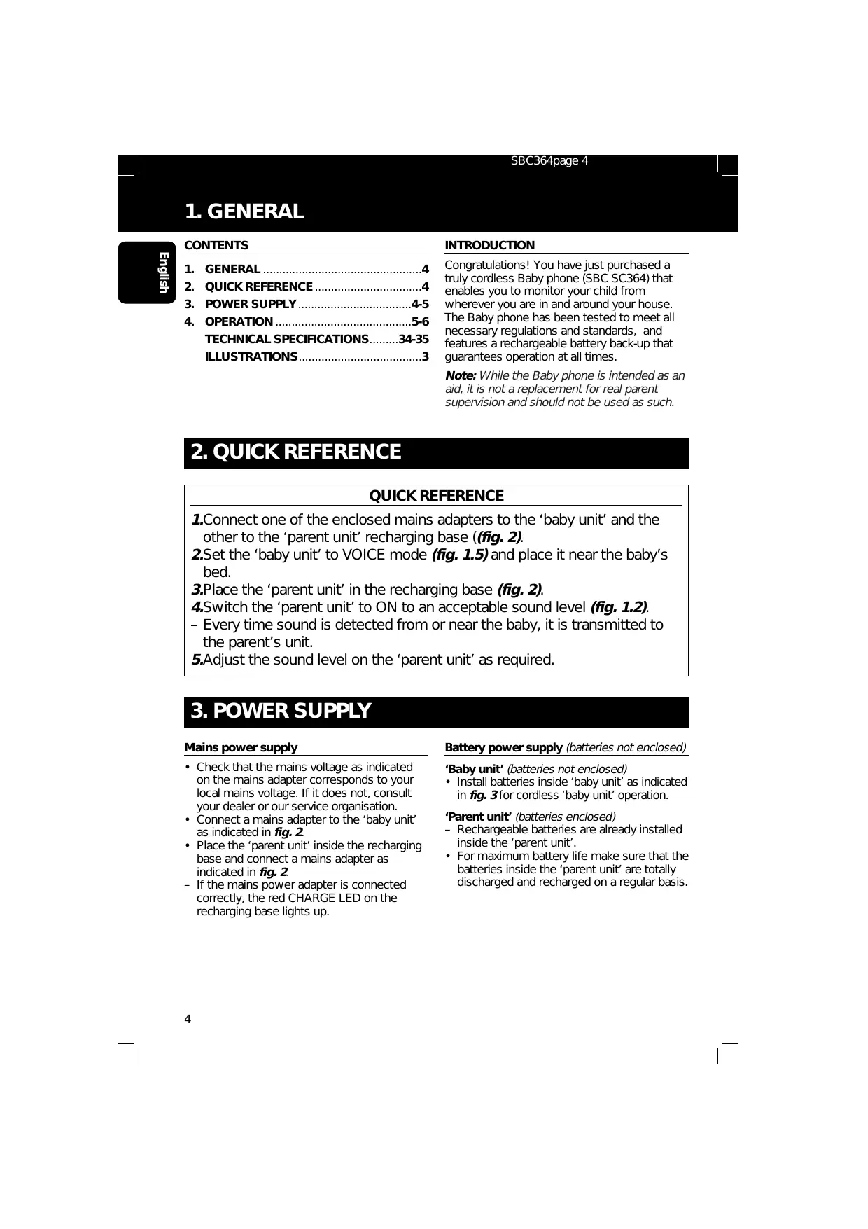 Congratulations! You have just purchased a truly cordless Baby phone (SBC SC364) that enables you to monitor your child from wherever you are in and around your house. The Baby phone has been tested to meet all necessary regulations and standards, and features a rechargeable battery back-up that guarantees operation at all times. Note: While the Baby phone is intended as an aid, it is not a replacement for real parent supervision and should not be used as such. 1.Connect one of the enclosed mains adapters to the ‘baby unit’ and the other to the ‘parent unit’ recharging base ((fig. 2). 2.Set the ‘baby unit’ to VOICE mode (fig. 1.5) and place it near the baby’s bed. 3.Place the ‘parent unit’ in the recharging base (fig. 2). 4.Switch the ‘parent unit’ to ON to an acceptable sound level (fig. 1.2). – Every time sound is detected from or near the baby, it is transmitted to the parent’s unit. 5.Adjust the sound level on the ‘parent unit’ as required.