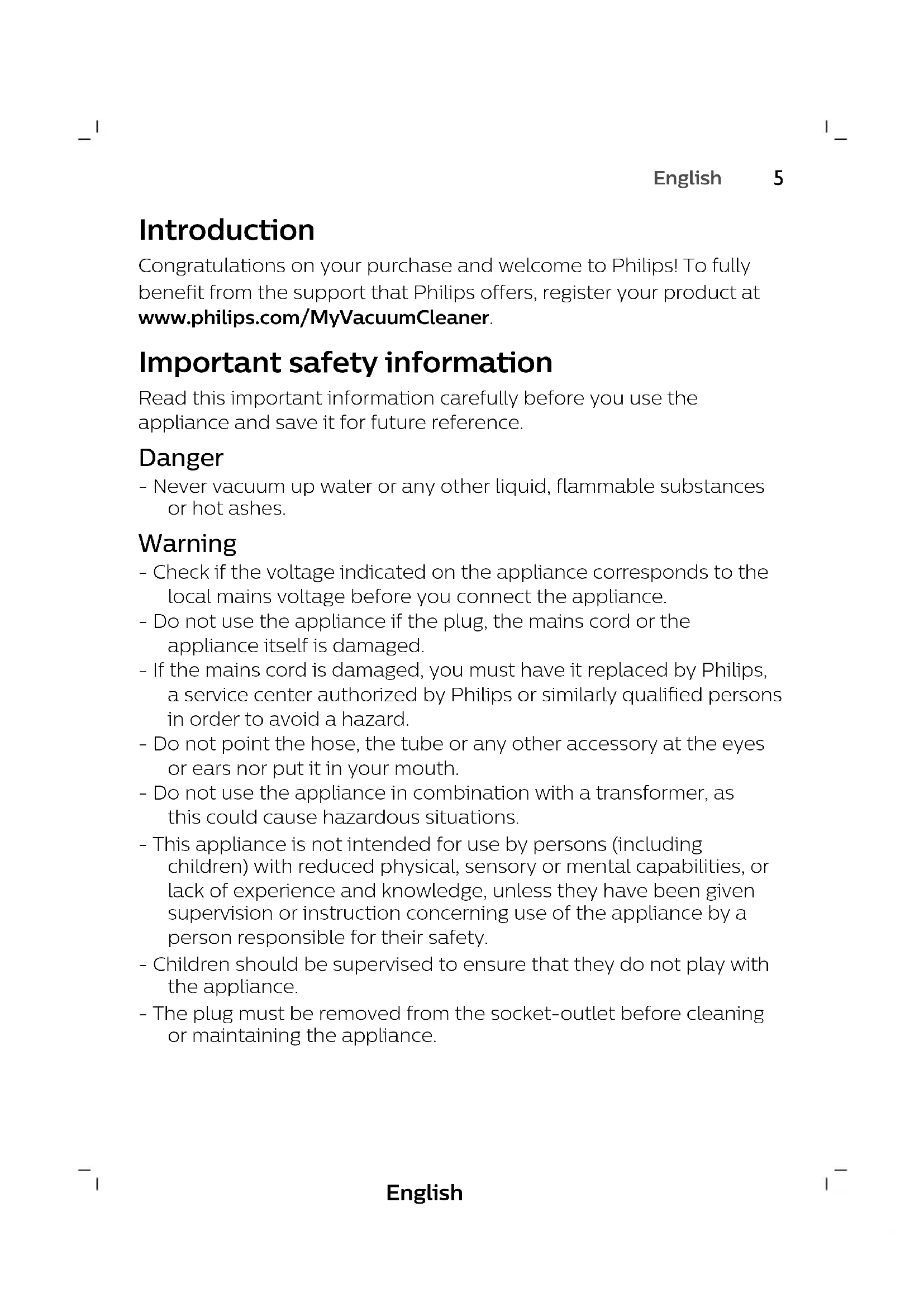 English Introduction Congratulations on your purchase and welcome to Philips! To fully benefit from the support that Philips offers, register your product at www.philips.com/MyVacuumCleaner. Important safety information Read this important information carefully before you use the appliance and save it for future reference. Danger - Never vacuum up water or any other liquid, flammable substances or hot ashes. Warning - Check if the voltage indicated on the appliance corresponds to the local mains voltage before you connect the appliance. - Do not use the appliance if the plug, the mains cord or the appliance itself is damaged. - If the mains cord is damaged, you must have it replaced by Philips, a service center authorized by Philips or similarly qualified persons in order to avoid a hazard. - Do not point the hose, the tube or any other accessory at the eyes or ears nor put it in your mouth. - Do not use the appliance in combination with a transformer, as this could cause hazardous situations. - This appliance is not intended for use by persons (including children) with reduced physical, sensory or mental capabilities, or lack of experience and knowledge, unless they have been given supervision or instruction concerning use of the appliance by a person responsible for their safety. - Children should be supervised to ensure that they do not play with the appliance. - The plug must be removed from the socket-outlet before cleaning or maintaining the appliance.6 English - This vacuum cleaner is designed for household use only. Do not use this vacuum cleaner to vacuum up building waste, cement dust, ashes, fine sand, lime and similar substances. Never use the vacuum cleaner without any of the filters. This could damage the motor and shorten the life of the vacuum cleaner. Always clean all parts of the vacuum cleaner as shown in the user manual. Do not clean any parts with water and/or cleaning agents if this is not specifically shown in the user manual. Caution - Never use the appliance without any of the filters. This could damage the motor and shorten the life of the appliance. - Always clean all parts as shown in the user manual. Do not clean any parts with water and/or cleaning agents if this is not particularly shown in the user manual. - If you clean a washable filter with water, make sure it is completely dry before you put it back into the appliance. Do not dry the filter in direct sunlight, on a radiator or in a tumble dryer. Replace a washable filter if it can no longer be cleaned properly or if it is damaged. - To guarantee optimal dust retention and performance of the vacuum cleaner, always replace the filters with original Philips filters of the correct type (see 'Ordering accessories'). - Maximum noise level: Lc = 84 dB(A) Electromagnetic fields (EMF) This Philips appliance complies with all applicable standards and regulations regarding exposure to electromagnetic fields. Ordering accessories To buy accessories or spare parts, visit www.philips.com/parts-and- accessories or go to your Philips dealer. You can also contact the Philips Consumer Care Center in your country (see the international warranty leaflet for contact details). Warranty and support If you need information or support, please visit www.philips.com/support or read the international warranty leaflet.7 English Recycling - Do not throw away the product with the normal household waste at the end of its life, but hand it in at an official collection point for recycling. By doing this, you help to preserve the environment. - Follow your country's rules for the separate collection of electrical and electronic products. Correct disposal helps prevent negative consequences for the environment and human health. Troubleshooting This chapter summarizes the most common problems you could encounter with the appliance. If you are unable to solve the problem with the information below, visit www.philips.com/support for a list of frequently asked questions or contact the Consumer Care Center in your country. Problem Possible cause Solution The suction power is insufficient. The dust container is full. Empty the dust container. The filters are dirty. Clean or replace the filters. The suction power is set to a low setting. Increase the suction power with the regulator on the appliance or on the handgrip. The nozzle, tube or hose is blocked up. To remove the obstruction, disconnect the blocked-up item and connect it (as far as possible) the other way around. Switch on the vacuum cleaner to force the air through the blocked-up item in opposite direction.8 English Problem Possible cause Solution When I use my vacuum cleaner I sometimes feel electric shocks. Your vacuum cleaner builds up static electricity. The lower the air humidity, the more static electricity the appliance builds up. Discharge the appliance by frequently holding the tube against other metal objects in the room (for example the legs of a table or chair, a radiator etc.). You can also raise the air humidity level in the room.Bahasa Melayu