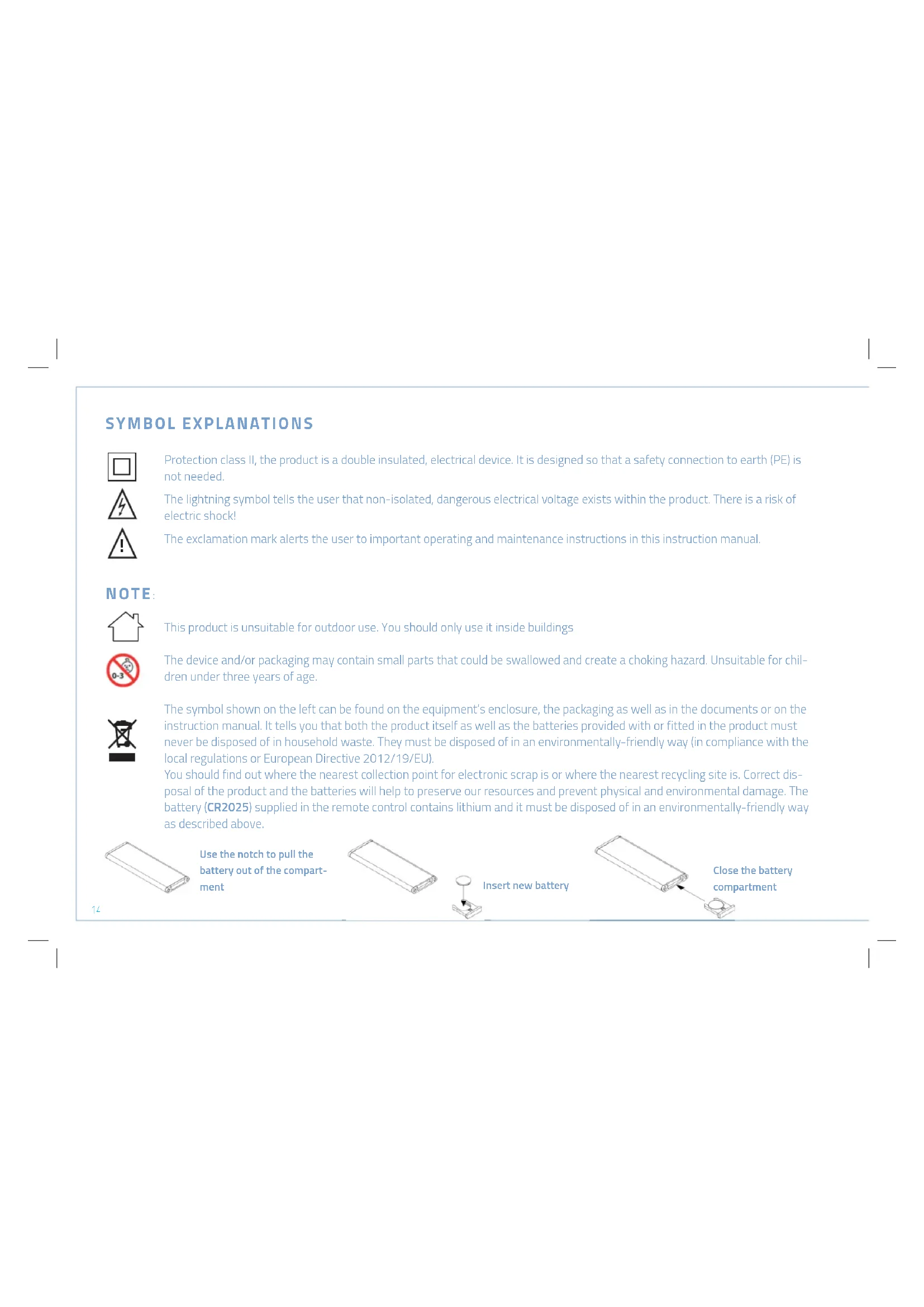 Use the notch to pull the battery out of the compart- ment Insert new battery Close the battery compartment SYMBOL EXPLANATIONS Protection class II, the product is a double insulated, electrical device. It is designed so that a safety connection to earth (PE) is not needed. The lightning symbol tells the user that non-isolated, dangerous electrical voltage exists within the product. There is a risk of electric shock! The exclamation mark alerts the user to important operating and maintenance instructions in this instruction manual. NOTE: This product is unsuitable for outdoor use. You should only use it inside buildings The device and/or packaging may contain small parts that could be swallowed and create a choking hazard. Unsuitable for chil- dren under three years of age. The symbol shown on the left can be found on the equipment‘s enclosure, the packaging as well as in the documents or on the instruction manual. It tells you that both the product itself as well as the batteries provided with or fitted in the product must never be disposed of in household waste. They must be disposed of in an environmentally-friendly way (in compliance with the local regulations or European Directive 2012/19/EU). You should find out where the nearest collection point for electronic scrap is or where the nearest recycling site is. Correct dis- posal of the product and the batteries will help to preserve our resources and prevent physical and environmental damage. The battery (CR2025) supplied in the remote control contains lithium and it must be disposed of in an environmentally-friendly way as described above.EN