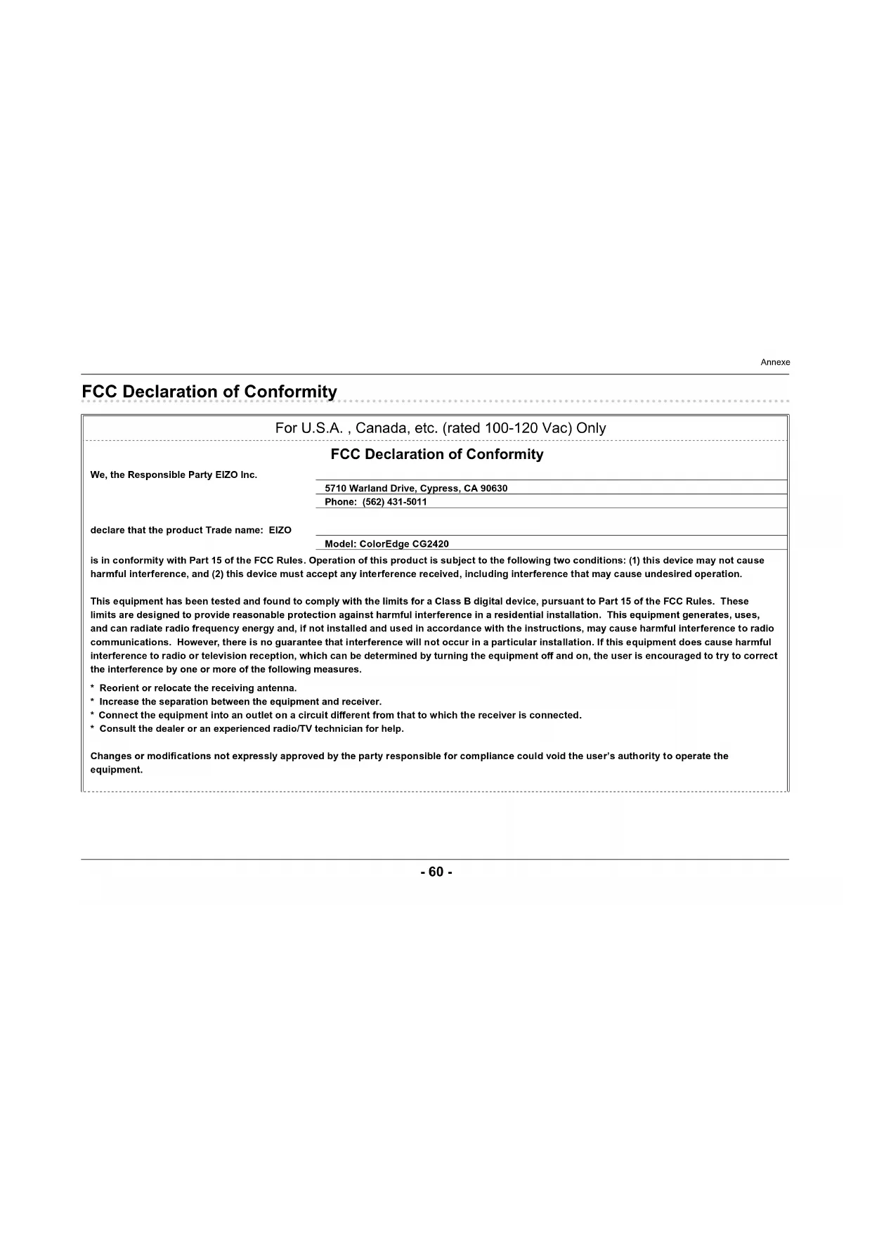FCC Declaration of Conformity For U.S.A. , Canada, etc. (rated 100-120 Vac) Only FCC Declaration of Conformity We, the Responsible Party EIZO Inc. 5710 Warland Drive, Cypress, CA 90630 Phone: (562) 431-5011 declare that the product Trade name: EIZO Model: ColorEdge CG2420 is in conformity with Part 15 of the FCC Rules. Operation of this product is subject to the following two conditions: (1) this device may not cause harmful interference, and (2) this device must accept any interference received, including interference that may cause undesired operation. This equipment has been tested and found to comply with the limits for a Class B digital device, pursuant to Part 15 of the FCC Rules. These limits are designed to provide reasonable protection against harmful interference in a residential installation. This equipment generates, uses, and can radiate radio frequency energy and, if not installed and used in accordance with the instructions, may cause harmful interference to radio communications. However, there is no guarantee that interference will not occur in a particular installation. If this equipment does cause harmful interference to radio or television reception, which can be determined by turning the equipment off and on, the user is encouraged to try to correct the interference by one or more of the following measures.