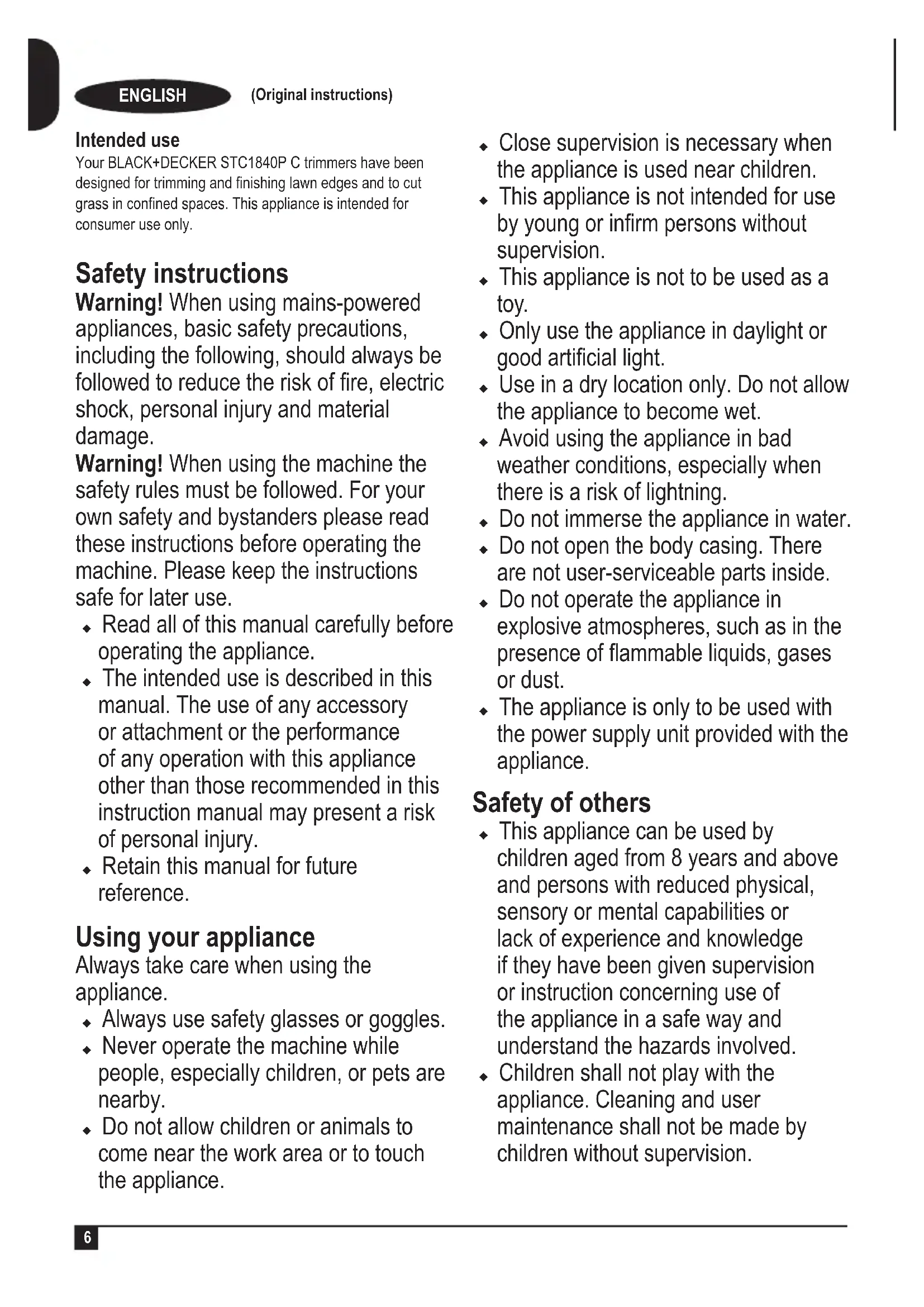 ENGLISH (Original instructions) Intended use Your BLACK+DECKER STC1840P C trimmers have been designed for trimming and nishing lawn edges and to cut grass in conned spaces. This appliance is intended for consumer use only. Safety instructions Warning! When using mains-powered appliances, basic safety precautions, including the following, should always be followed to reduce the risk of re, electric shock, personal injury and material damage. Warning! When using the machine the safety rules must be followed. For your own safety and bystanders please read these instructions before operating the machine. Please keep the instructions safe for later use. u Read all of this manual carefully before operating the appliance. u The intended use is described in this manual. The use of any accessory or attachment or the performance of any operation with this appliance other than those recommended in this instruction manual may present a risk of personal injury. u Retain this manual for future reference. Using your appliance Always take care when using the appliance. u Always use safety glasses or goggles.u Never operate the machine while people, especially children, or pets are nearby. u Do not allow children or animals to come near the work area or to touch the appliance. u Close supervision is necessary when the appliance is used near children. u This appliance is not intended for use by young or inrm persons without supervision. u This appliance is not to be used as a toy. u Only use the appliance in daylight or good articial light. u Use in a dry location only. Do not allow the appliance to become wet. u Avoid using the appliance in bad weather conditions, especially when there is a risk of lightning. u Do not immerse the appliance in water.u Do not open the body casing. There are not user-serviceable parts inside. u Do not operate the appliance in explosive atmospheres, such as in the presence of ammable liquids, gases or dust. uThe appliance is only to be used with the power supply unit provided with the appliance. Safety of others u This appliance can be used by children aged from 8 years and above and persons with reduced physical, sensory or mental capabilities or lack of experience and knowledge if they have been given supervision or instruction concerning use of the appliance in a safe way and understand the hazards involved. u Children shall not play with the appliance. Cleaning and user maintenance shall not be made by children without supervision.7 ENGLISH (Original instructions) Residual risks Additional residual risks may arise when using the tool which may not be included in the enclosed safety warnings. These risks can arise from misuse, prolonged use etc. Even with the application of the relevant safety regulations and the implementation of safety devices, certain residual risks can not be avoided. These include: uInjuries caused by touching any rotating/moving parts. uInjuries caused when changing any parts, blades or accessories. uInjuries caused by prolonged use of a tool. When using any tool for prolonged periods ensure you take regular breaks. uImpairment of hearing. uHealth hazards caused by breathing dust developed when using your tool (example:- working with wood, especially oak, beech and MDF.) After use uWhen not in use, the appliance should be stored in a dry, well ventilated place out of reach of children. uChildren should not have access to stored appliances. uWhen the appliance is stored or transported in a vehicle it should be placed in the boot or restrained to prevent movement following sudden changes in speed or direction. Inspection and repairs uBefore use, check the appliance for damaged or defective parts. Check for breakage of parts and any other conditions that may affect its operation. uDo not use the appliance if any part is damaged or defective. uHave any damaged or defective parts repaired or replaced by an authorised repair agent. uNever attempt to remove or replace any parts other than those specied in this manual. Vibration The declared vibration emission values stated in the technical data and the declaration of conformity have been measured in accordance with a standard test method provided by EN50636 and may be used for comparing one tool with another. The declared vibration emission value may also be used in a preliminary assessment of exposure. Warning! The vibration emission value during actual use of the power tool can differ from the declared value depending on the ways in which the tool is used. The vibration level may increase above the level stated. When assessing vibration exposure to determine safety measures required by 2002/44/EC to protect persons regularly using power tools in employment, an estimation of vibration exposure should consider, the actual conditions of use and the way the tool is used, including taking account of all parts of the operating cycle such as the times when the tool is switched off and when it is running idle in addition to the trigger time.8 ENGLISH (Original instructions) Additional safety instructions for grass trimmers Warning! Cutting elements continue to rotate after the motor is switched off. uBe familiar with the controls and the proper use of the appliance. uAlways remove the battery from the appliance whenever the appliance is unattended, before clearing a blockage, before cleaning and maintenance, after striking a foreign object or whenever the appliance starts vibrating abnormally. uWear stout shoes or boots to protect your feet. uWear long trousers to protect your legs. uBefore using the appliance, check that your cutting path is free from sticks, stones, wire and any other obstacles. uOnly use the appliance in the upright position, with the cutting line near the ground. Never switch the appliance on in any other position. uMove slowly when using the appliance. Be aware that freshly cut grass is damp and slippery. uDo not work on steep slopes. Work across the face of slopes, not up and down. uNever 