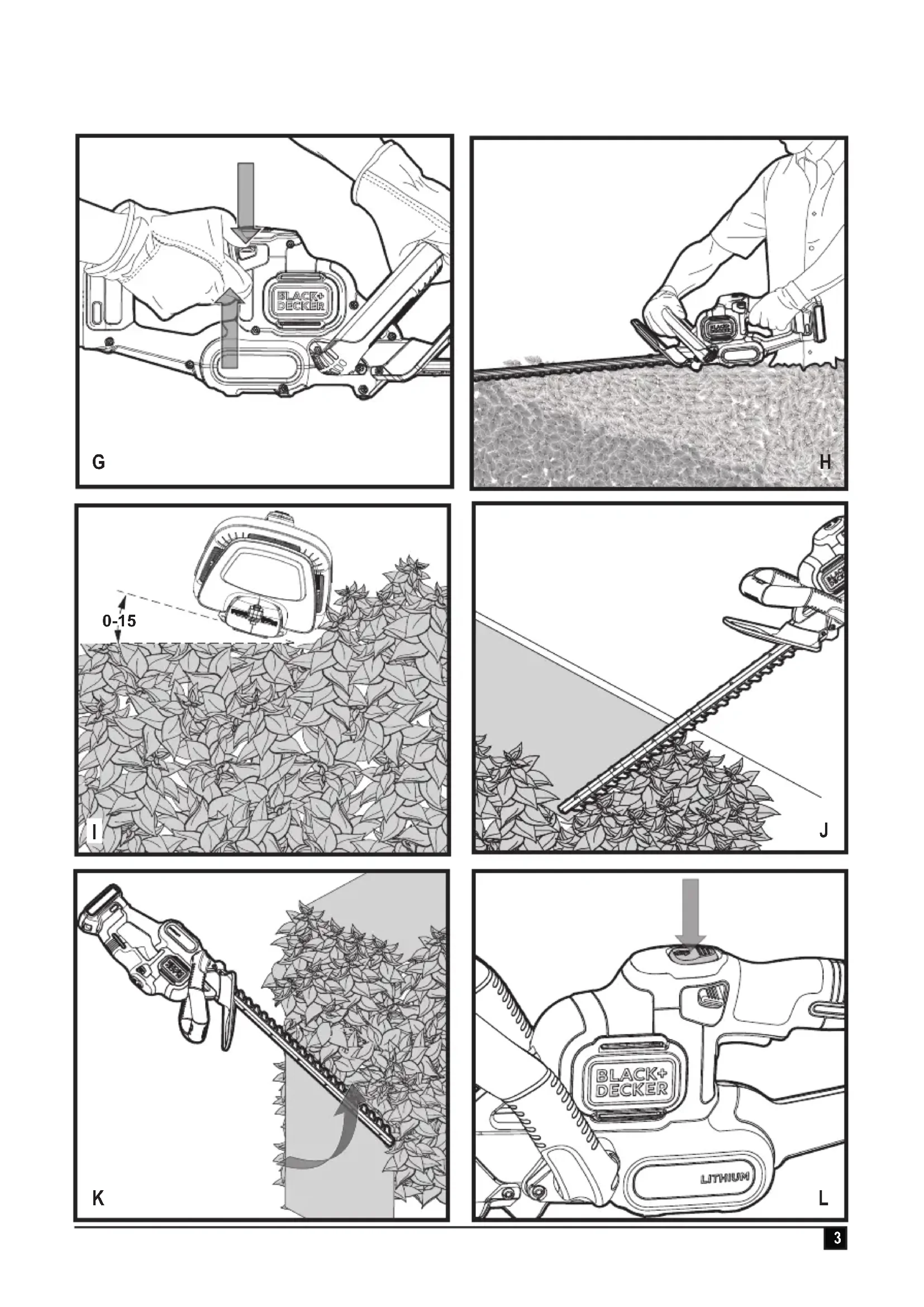 u The green LED will ash indicating that the battery is be- ing charged. u The completion of charge is indicated by the green LED remaining on continuously. The pack is fully charged and may be used at this time or left on the charger. Note: Recharge discharged batteries as soon as possible after use or battery life may be greatly diminished. For longest battery life, do not discharge batteries fully. It is recommended that the batteries be recharged after each use. Leaving the battery in the charger The charger and battery pack can be left connected with the LED glowing indenitely. The charger will keep the battery pack fresh and fully charged. Important charging notes u Longest life and best performance can be obtained if the battery pack is charged when the air temperature is between 65°F and 75°F (18°- 24°C). DO NOT charge the battery pack in an air temperature below +40°F (+4.5°C), or above +105°F (+40.5°C). This is important and will prevent serious damage to the battery pack. u The charger and battery pack may become warm to touch while charging. This is a normal condition, and does not indicate a problem. To facilitate the cooling of the battery pack after use, avoid placing the charger or battery pack in a warm environment such as in a metal shed, or an uninsulated trailer. u If the battery pack does not charge properly: u Check current at receptacle by plugging in a lamp or other appliance. u Check to see if receptacle is connected to a light switch which turns power off when you turn out the lights. u Move charger and battery pack to a location where the surrounding air temperature is approximately 65°F - 75°F (18°- 24°C). u If charging problems persist, take the tool, battery pack and charger to your local service center. u The battery pack should be recharged when it fails to produce sufcient power on jobs which were easily done previously. DO NOT CONTINUE to use under these conditions. Follow the charging procedure. You may also charge a partially used pack whenever you desire with no adverse affect on the battery pack. u Foreign materials of a conductive nature such as, but not limited to, steel wool, aluminium foil, or any buildup of metallic particles should be kept away from charger cavities. Always unplug the charger from the power supply when there is no battery pack in the cavity. Unplug charger before attempting to clean. u Do not freeze or immerse charger in water or any other liquid. Warning! Do not allow any liquid to get inside charger. Never attempt to open the battery pack for any reason. If the plastic housing of the battery pack breaks or cracks, return to a service center for recycling. Installing and removing the battery pack from the tool Warning! Make certain the lock-off button is engaged to prevent switch actuation before removing or installing battery.8 ENGLISH (Original instructions) To install battery pack u Insert battery (8) into tool until an audible click is heard (Figure. B) u Ensure battery pack is fully seated and fully latched into position. To remove battery pack u Depress the battery release button as shown in gure C and pull battery pack out of tool. Assembly instructions Warning! Make certain the battery is removed before assem- bly or disassembly of any parts. Assembly tools required (not supplied):- phillips screw- driver. Attaching guard and bail handle to trimmer Warning! Only use with handle and guard properly assembled to hedge trimmer. The use of the hedge trimmer without the proper guard or handle provided may result in serious personal injury. The trimmer is shipped with the guard and bail handle at- tached with a plastic zip tie. To assemble to trimmer: u Cut the plastic zip tie. u Remove the six screws that are partially run into the trim- mer housing (Figure D). u Slide the guard (5) onto the front of the trimmer housing as shown in gure E u Insert two of the six screws into the openings on the sides of the guard and tighten securely. u Slide the bail handle (6) onto the front of the trimmer hous- ing behind the guard as shown in gure F. u Insert the remaining four screws into the openings on the sides of the bail handle and tighten securely. Operation u To turn the unit on, push the lock off button (2) down, squeeze the trigger (1) and depress the dual switch bail handle(6), as shown in gure G. Once the unit is running, you may release the lock-off button. In order to keep the unit running you must continue to squeeze the trigger. Warning! Never attempt to lock a switch in the on position. Trimming Instructions u Maintain proper footing and balance and do not overreach. Wear safety goggles, non-skid footwear when trimming. Hold the unit rmly in both hands and turn the unit ON. Always hold the trimmer, as shown in the illustrations in this manual, with one hand on the switch handle and one hand on the bail handle (gure H). Never hold the unit by the blade guard. Trimming new growth (Fig. I) u A wide, sweeping motion, feeding the blade teeth through the twigs is most effective. A slight downward tilt of the blade, in the direction of motion gives the best cutting. Warning! Do not cut stems greater than 19mm. Use the trimmer only for cutting normal shrubbery around houses and buildings. Level hedges (Fig. J) u To obtain exceptionally level hedges a piece of string can be stretched along the length of the hedge as a guide. Side trimming hedges (Fig. K) u Hold the trimmer as shown and begin at the bottom and sweep up. POWERCOMMAND If you encounter a jam, depress the POWERCOMMAND button (4) shown in gure l. The blades will move back and forth in a slower, more forceful rhythm to help cut through dif- cult branches. Release the button to return to normal hedge trimming usage. Note: Once the button is released, the blades will immediately return to full speed. Note: The blades will stop when the button is held for 15 sec- onds. To reengage the POWERCOMMAND feature, release the button and depress it again. DO NOT continuo