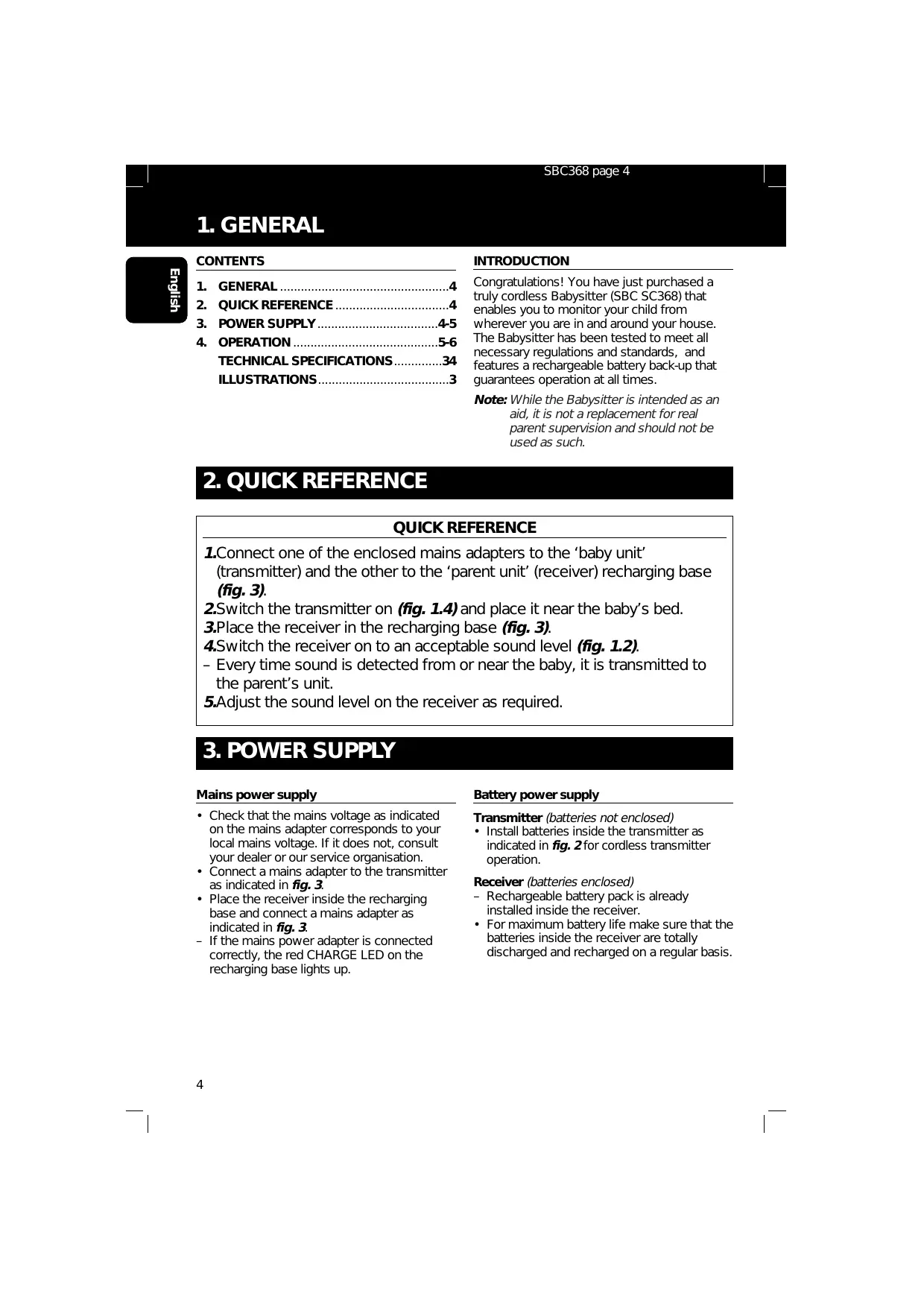 Congratulations! You have just purchased a truly cordless Babysitter (SBC SC368) that enables you to monitor your child from wherever you are in and around your house. The Babysitter has been tested to meet all necessary regulations and standards, and features a rechargeable battery back-up that guarantees operation at all times. Note: While the Babysitter is intended as an aid, it is not a replacement for real parent supervision and should not be used as such. 1.Connect one of the enclosed mains adapters to the ‘baby unit’ (transmitter) and the other to the ‘parent unit’ (receiver) recharging base (fig. 3). 2.Switch the transmitter on (fig. 1.4) and place it near the baby’s bed. 3.Place the receiver in the recharging base (fig. 3). 4.Switch the receiver on to an acceptable sound level (fig. 1.2). – Every time sound is detected from or near the baby, it is transmitted to the parent’s unit. 5.Adjust the sound level on the receiver as required.