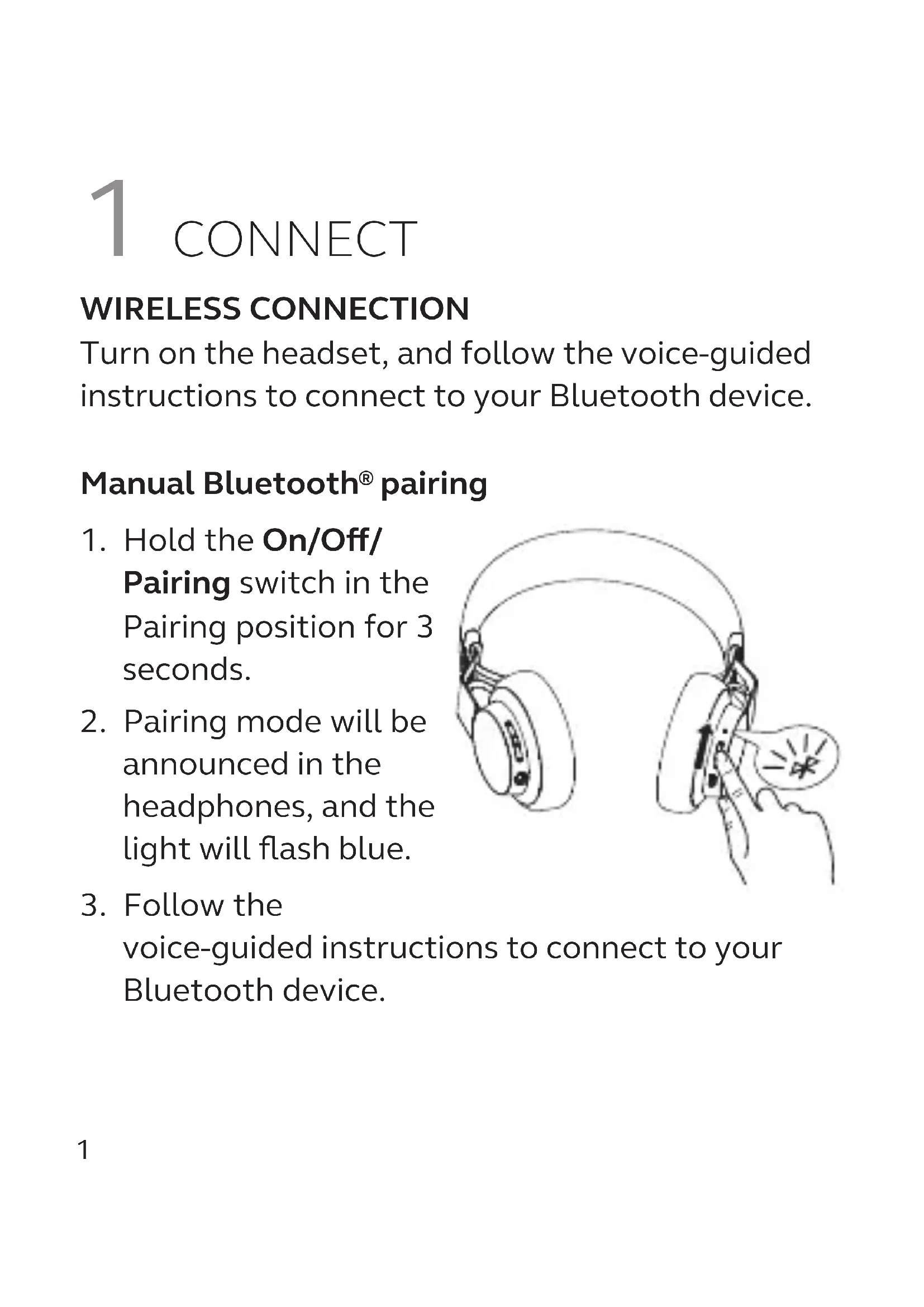 voice-guided instructions to connect to your Bluetooth device. WIRELESS CONNECTION Turn on the headset, and follow the voice-guided instructions to connect to your Bluetooth device.2