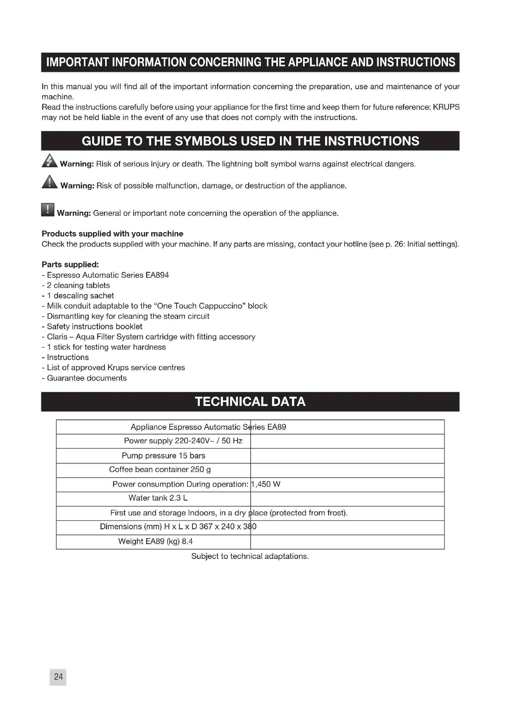 Products supplied with your machine Check the products supplied with your machine. If any parts are missing, contact your hotline (see p. 26: Initial settings). Parts supplied: - Espresso Automatic Series EA894 - 2 cleaning tablets - 1 descaling sachet - Milk conduit adaptable to the “One Touch Cappuccino” block - Dismantling key for cleaning the steam circuit - Safety instructions booklet - Claris – Aqua Filter System cartridge with tting accessory - 1 stick for testing water hardness - Instructions - List of approved Krups service centres - Guarantee documents TECHNICAL DATA Appliance Espresso Automatic Series EA89 Power supply 220-240V~ / 50 Hz Pump pressure 15 bars Coffee bean container 250 g Power consumption During operation: 1,450 W Water tank 2.3 L First use and storage Indoors, in a dry place (protected from frost). Dimensions (mm) H x L x D 367 x 240 x 380 Weight EA89 (kg) 8.4 Subject to technical adaptations.