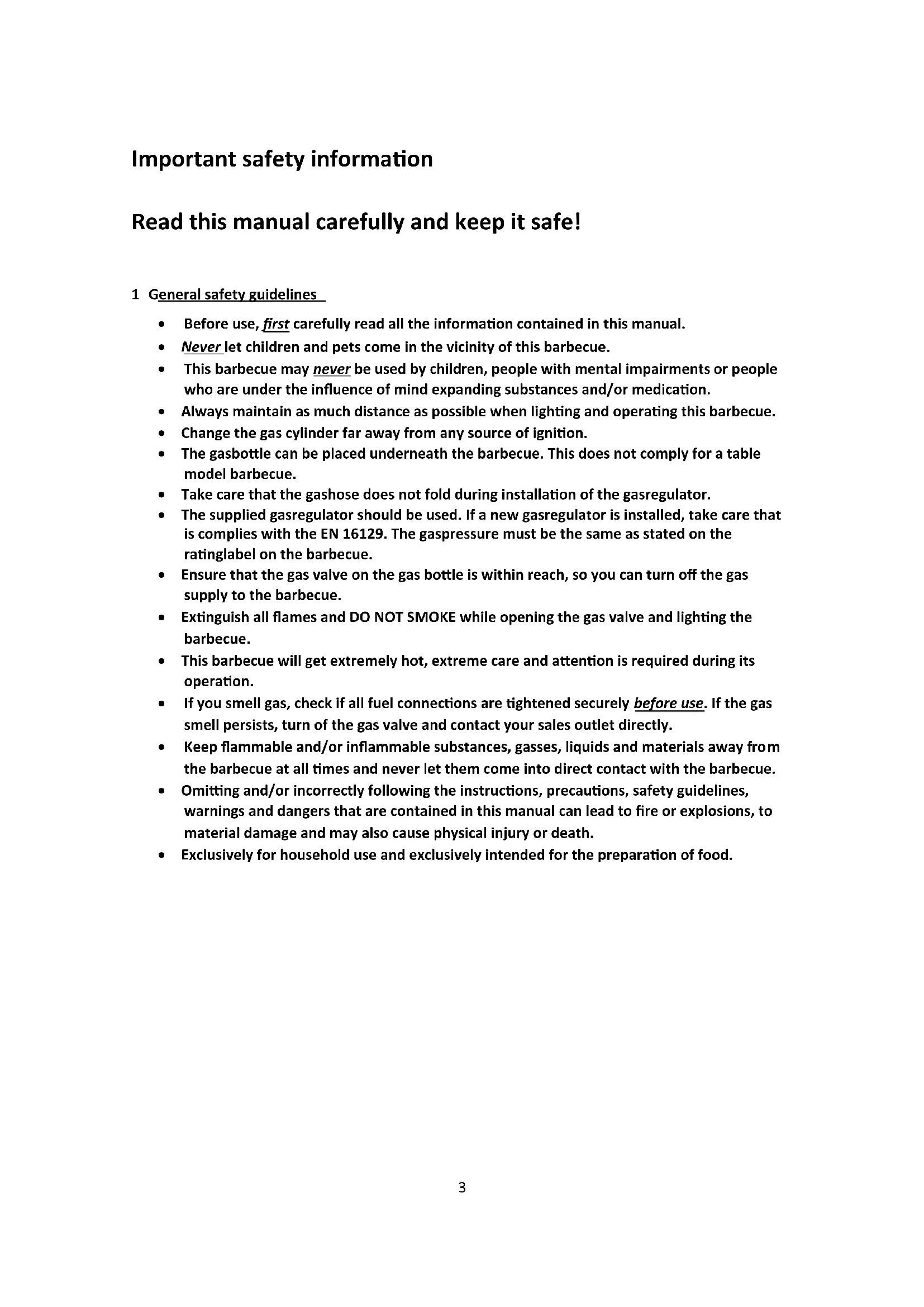 - Keep a distance of at least 3 metres between the barbecue and all flammable and/or inflammable materials (wood, plastic, foliage etc.), when the barbecue is in use.