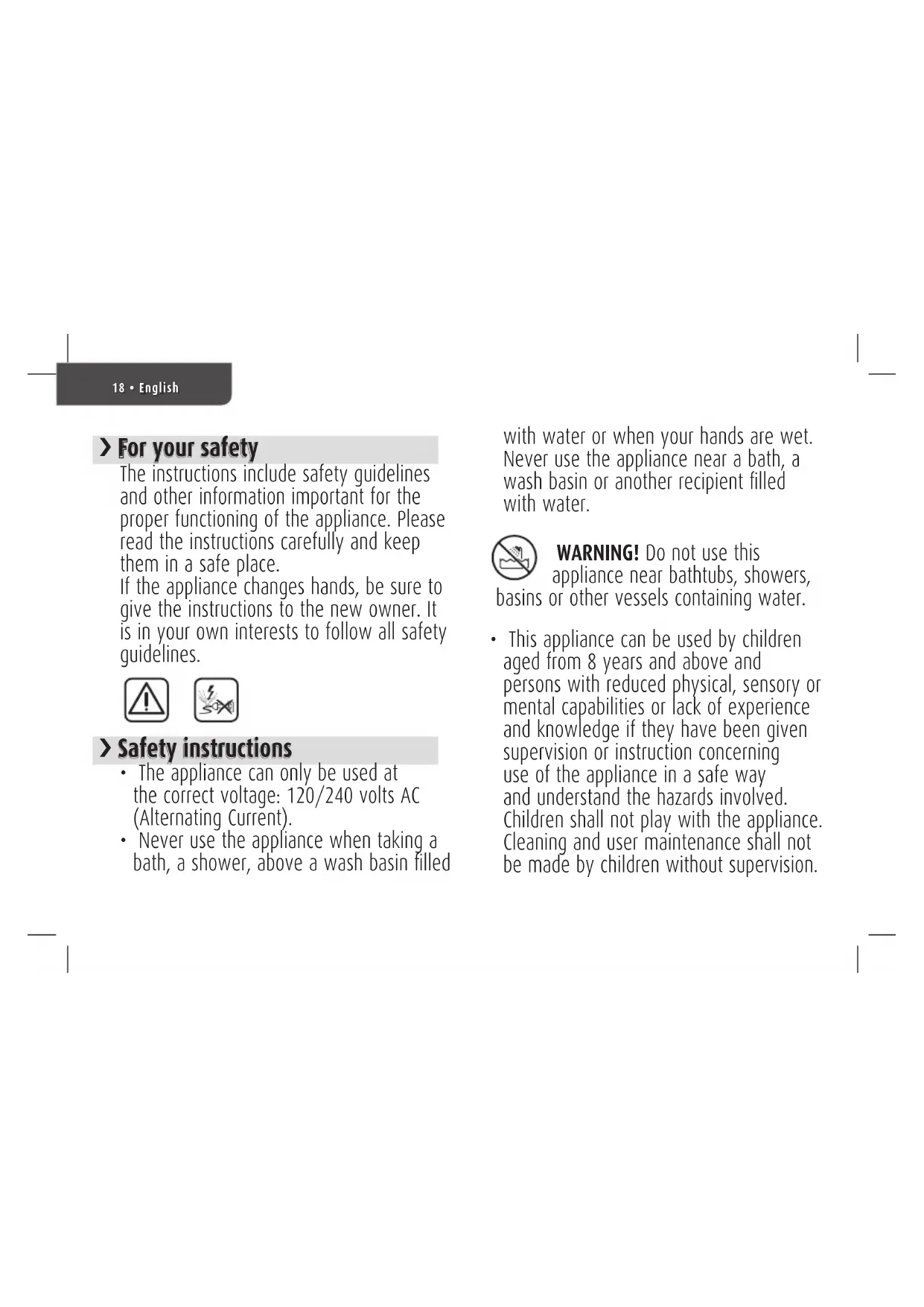 - The appliance can only be used at the correct voltage: 120/240 volts AC (Alternating Current).