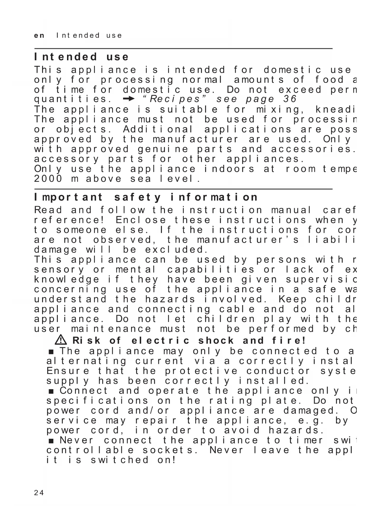 - Schüssel oder Winkelgetriebe (Zubehör) hat sich gelöst. ■ Drehschalter auf y stellen. Netzstecker ausstecken. ■ Schüssel bis zum Anschlag festdrehen. ■ Winkelgetriebe festdrehen und Verschlusshebel vollständig schließen. ZUM WIEGEN STOPP GERAET Waage wurde bei laufendem Gerät eingeschaltet. ■ Das Gerät ausschalten und den Stillstand abwarten, bevor die Waage verwendet wird.24 en Intended use Intended use This appliance is intended for domestic use only. Use the appliance only for processing normal amounts of food and for normal amounts of time for domestic use. Do not exceed permitted maximum quantities. X “Recipes” see page 36 The appliance is suitable for mixing, kneading and beating food. The appliance must not be used for processing other substances or objects. Additional applications are possible if the accessories approved by the manufacturer are used. Only use the appliance with approved genuine parts and accessories. Never use the accessory parts for other appliances. Only use the appliance indoors at room temperature and up to 2000 m above sea level. Important safety information Read and follow the instruction manual carefully and keep for later reference! Enclose these instructions when you give this appliance to someone else. If the instructions for correct use of the appliance are not observed, the manufacturer’s liability for any resulting damage will be excluded. This appliance can be used by persons with reduced physical, sensory or mental capabilities or lack of experience and/or knowledge if they have been given supervision or instruction concerning use of the appliance in a safe way and if they understand the hazards involved. Keep children away from the appliance and connecting cable and do not allow them to use the appliance. Do not let children play with the appliance. Cleaning and user maintenance must not be performed by children. W Risk of electric shock and fire! ■ The appliance may only be connected to a power supply with alternating current via a correctly installed socket with earthing. Ensure that the protective conductor system of the domestic supply has been correctly installed. ■ Connect and operate the appliance only in accordance with the specifications on the rating plate. Do not use the appliance if the power cord and/or appliance are damaged. Only our customer service may repair the appliance, e.g. by replacing a damaged power cord, in order to avoid hazards. ■ Never connect the appliance to timer switches or remote- controllable sockets. Never leave the appliance unattended while it is switched on!25 en Important safety information ■ Do not place the appliance on or near hot surfaces, e.g. hobs. The power cord must not come into contact with hot parts or be pulled across sharp edges. ■ Never immerse the base unit in water or place it in the dishwasher. Do not steam-clean the appliance. Do not use the appliance with damp hands. ■ After each use, whenever the appliance is unsupervised, prior to assembly, prior to disassembly, prior to cleaning and in the event of an error, the appliance must always be disconnected from the mains. W Risk of injury! ■ Before replacing accessories or additional parts which move during operation, the appliance must be switched off and disconnected from the power supply. ■ Whenever the swivel arm is lowered, do not reach into the housing to avoid your fingers or hands getting caught. Do not adjust the swivel arm while the appliance is switched on. ■ Only use tools when the bowl is inserted, the cover is fitted and the protective drive covers are in place! When using accessories, fit the bowl, cover and drive covers according to the instructions! ■ While operating the appliance, never reach into the bowl or filling shaft with your hands. Do not insert any objects (e.g. wooden spoon) into the bowl or filling shaft. Keep hands, hair, clothing and other utensils away from rotating parts. After switching off, the drive continues for a short time. Wait until the drive has come to a standstill. ■ Never use tools and accessories or 2 accessories at the same time. When using the accessories, follow the individual operating instructions enclosed. ■ When using accessories, observe the colour coding marked on the drives and accessories. W Risk of suffocation! Do not allow children to play with packaging material. W Caution! ■ We recommend that the appliance is never switched on for longer than is necessary to process the ingredients. Do not operate at no-load. ■ Your work surface should be easily accessible, resistant to moisture, firm, flat, dry and large enough to prevent any harm from splashing and to let you work unhindered.26 en Important safety information W Important! It is essential to clean the appliance thoroughly after each use or after it has not been used for an extended period. X “Cleaning and maintenance” see page 36 Congratulations on the purchase of your new Bosch appliance. You can find further information about our products on our website. www.bosch-home.com Our appliances continuously undergo further development. For this reason individual functions may differ from these instructions. In this case check whether a newer version of these instructions is available on our website. When using this instruction manual: You can fold out the cover pages of these instructions. There you will find illustrations marked with letters and numbering. Reference will be made to these illustrations throughout the manual (e.g. X Image sequence B). Contents Intended use p. 24