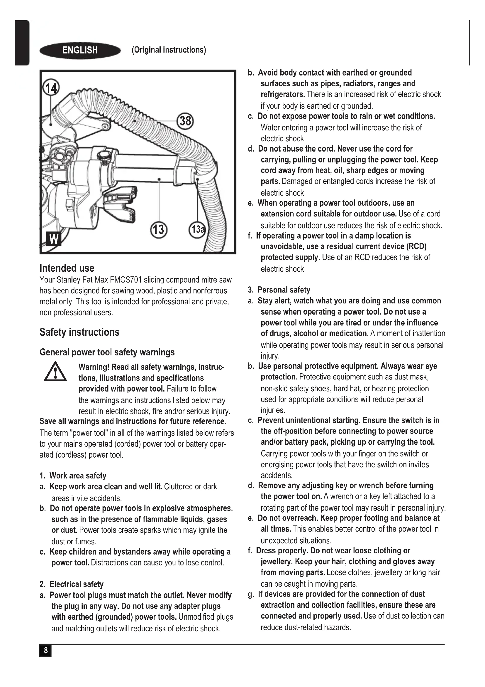 Your Stanley Fat Max FMCS701 sliding compound mitre saw has been designed for sawing wood, plastic and nonferrous metal only. This tool is intended for professional and private, non professional users.