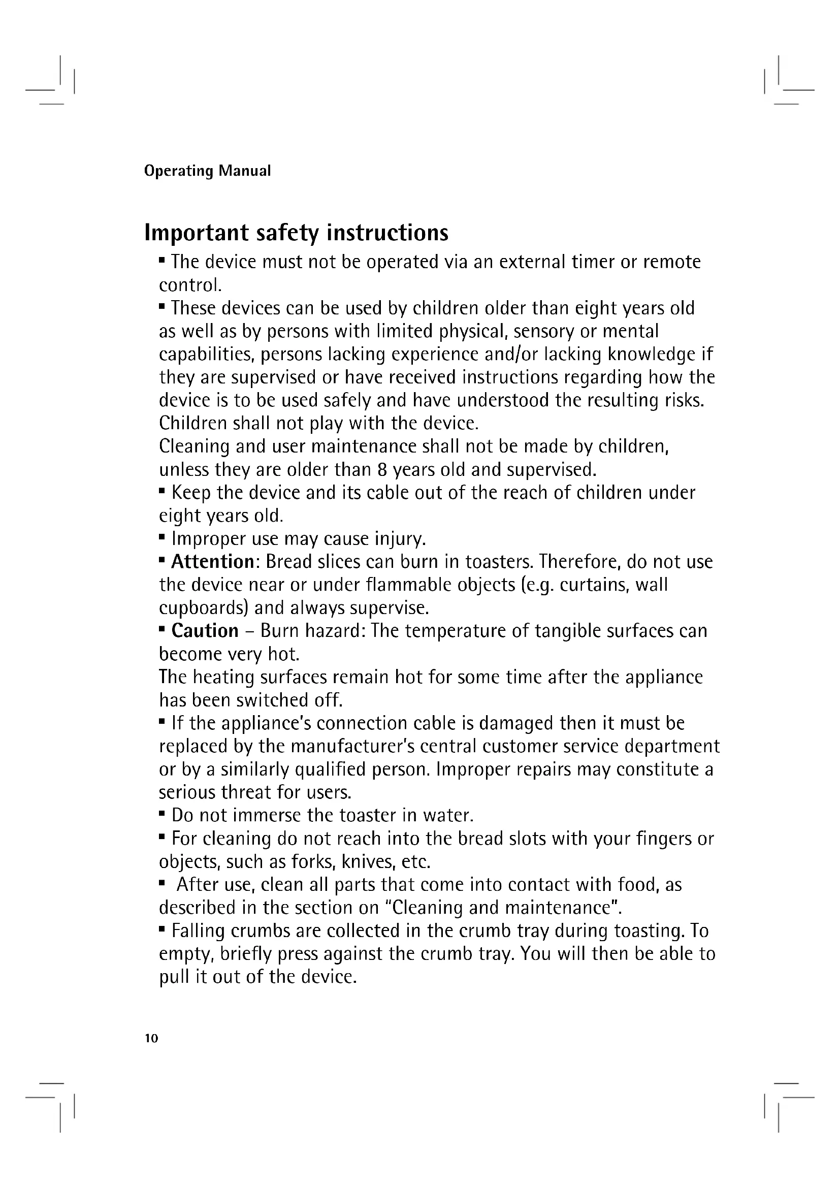 - Attention: Bread slices can burn in toasters. Therefore, do not use the device near or under flammable objects (e.g. curtains, wall cupboards) and always supervise.