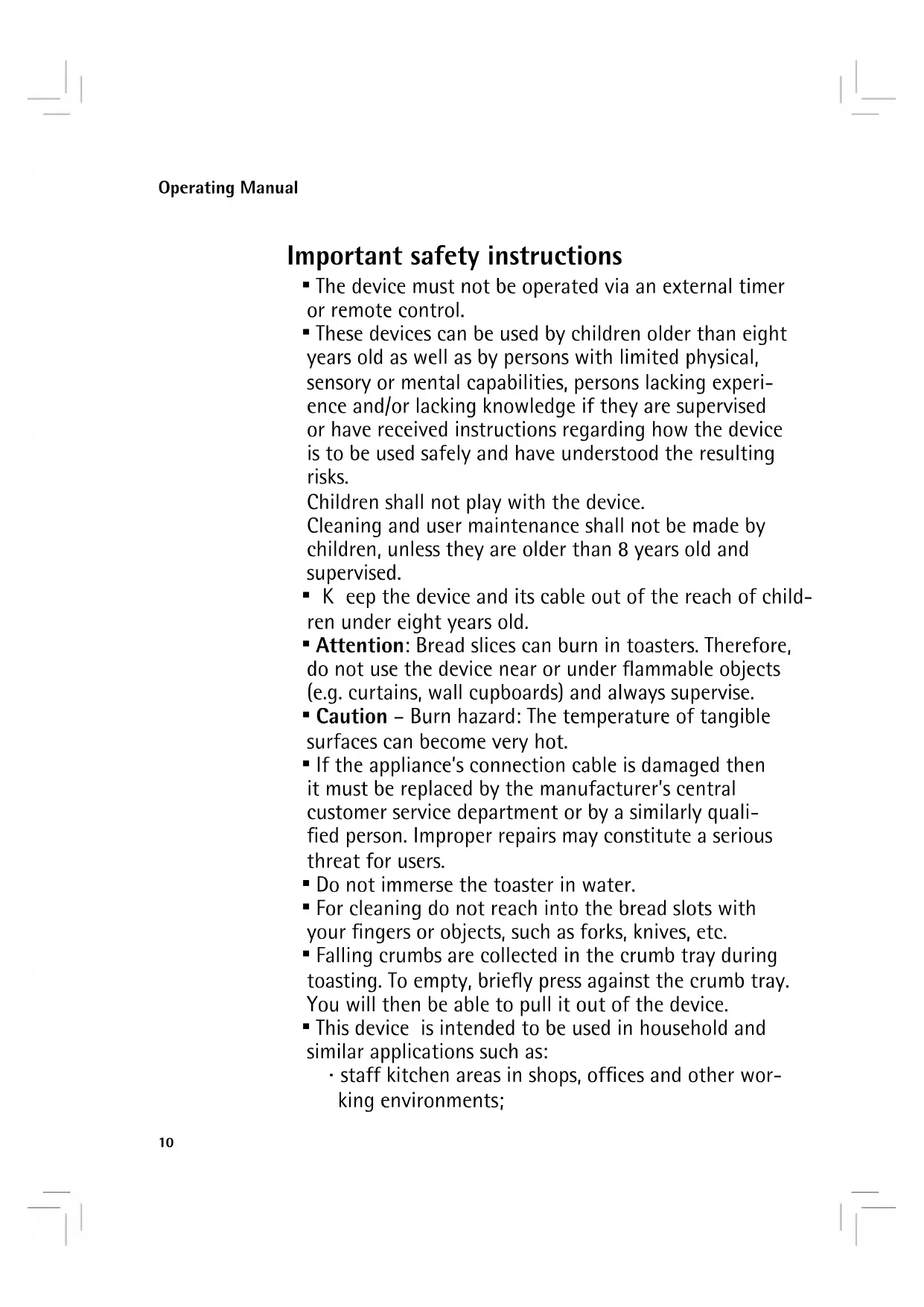- Attention: Bread slices can burn in toasters. Therefore, do not use the device near or under flammable objects (e.g. curtains, wall cupboards) and always supervise.