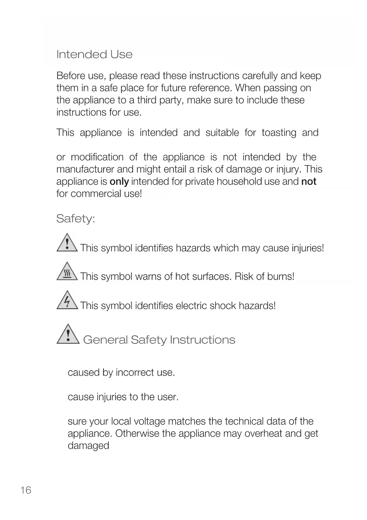 or modification of the appliance is not intended by the manufacturer and might entail a risk of damage or injury. This appliance is only intended for private household use and not for commercial use!