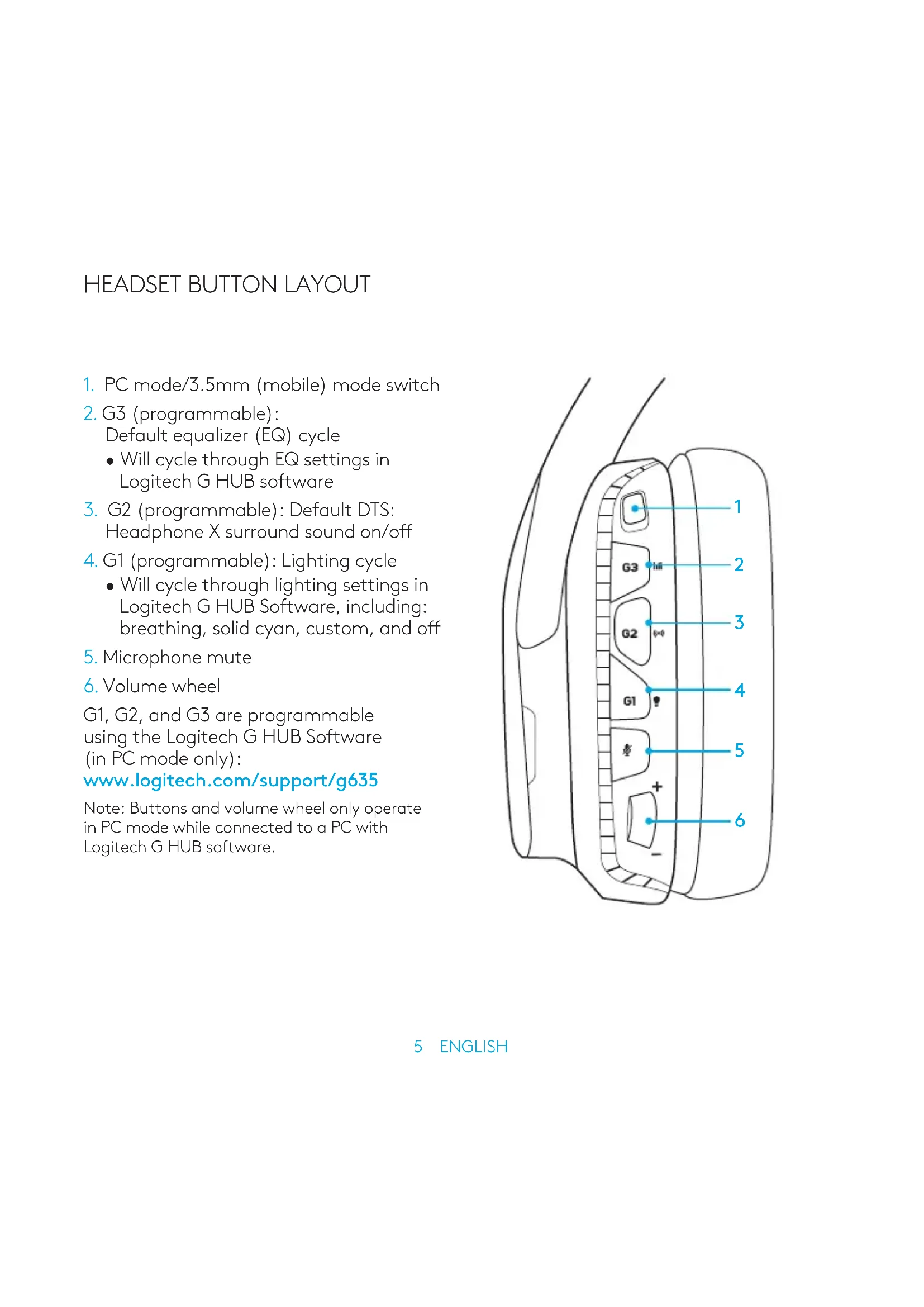 G1, G2, and G3 are programmable using the Logitech G HUB Software (in PC mode only): www.logitech.com/support/g635 Note: Buttons and volume wheel only operate in PC mode while connected to a PC with Logitech G HUB software.