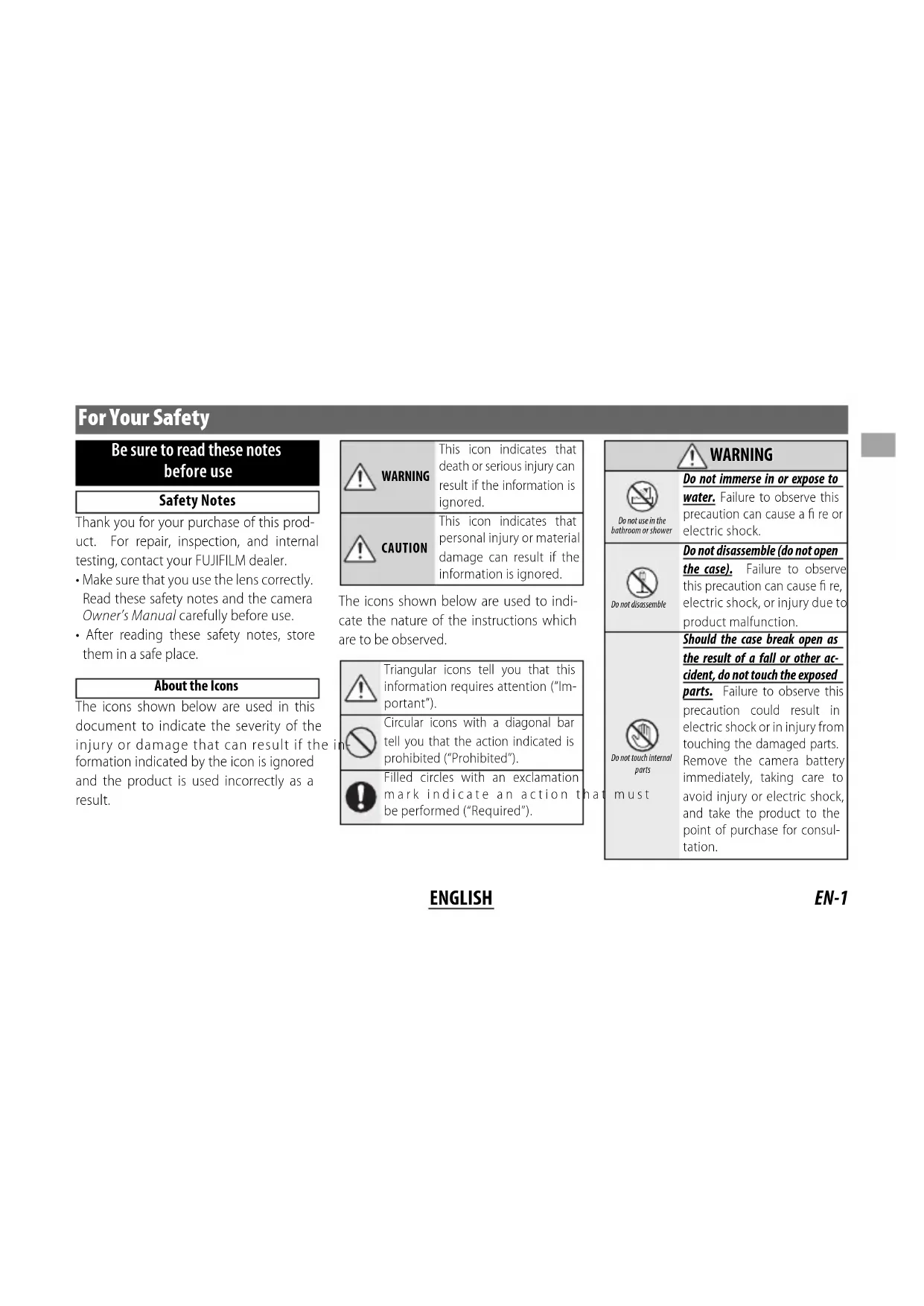 - After reading these safety notes, store them in a safe place. About the Icons The icons shown below are used in this document to indicate the severity of the injury or damage that can result if the in- formation indicated by the icon is ignored and the product is used incorrectly as a result. WARNINGThis icon indicates that death or serious injury can result if the information is ignored.CAUTIONThis icon indicates that personal injury or material damage can result if the information is ignored. The icons shown below are used to indi- cate the nature of the instructions which are to be observed. Triangular icons tell you that this information requires attention (“Im-portant”).Circular icons with a diagonal bar tell you that the action indicated is prohibited (“Prohibited”).Filled circles with an exclamation mark indicate an action that must be performed (“Required”). WARNING WARNING Do not use in the bathroom or showerDo not immerse in or expose to water. Failure to observe this precaution can cause a fi re or electric shock.Do not disassembleDo not disassemble (do not open the case). Failure to observe this precaution can cause fi re, electric shock, or injury due to product malfunction.Do not touch internal partsShould the case break open as the result of a fall or other ac-cident, do not touch the exposed parts. Failure to observe this precaution could result in electric shock or in injury from touching the damaged parts. Remove the camera battery immediately, taking care to avoid injury or electric shock, and take the product to the point of purchase for consul-tation.EN-2 ENGLISH WARNING WARNING Do not place on unstable sur- faces. The product may fall, causing injury. Do not view the sun through the lens or camera view nders. Failure to observe this precau- tion can cause permanent visual impairment. CAUTION CAUTION Do not use or store in locations that are exposed to steam, or smoke or are very humid or extremely dusty. Failure to observe this precaution can cause fi re or electric shock. Do not leave in direct sunlight or in locations subject to very high temperatures, such as in a closed vehicle on a sunny day. Failure to observe this precau- tion can cause fi re. CAUTION CAUTION Keep out of the reach of small children. This product could cause injury in the hands of a child. Do not handle with wet hands. Failure to observe this precau- tion can cause electric shock. Keep the sun out of the frame when shooting backlit subjects. Sunlight focused into the camera when the sun is in or close to the frame can cause fi r e o r b u r n s . When the product is not in use, replace the lens caps and store out of direct sunlight. Sunlight focused by the lens can cause fi r e o r b u r n s . Do not carry the camera or lens while they are attached to a tripod. The product can fall or strike other objects, caus- ing injury. For Customers in the U. S. A. For Customers in the U. S. A. Tested To Comply With FCC Standards