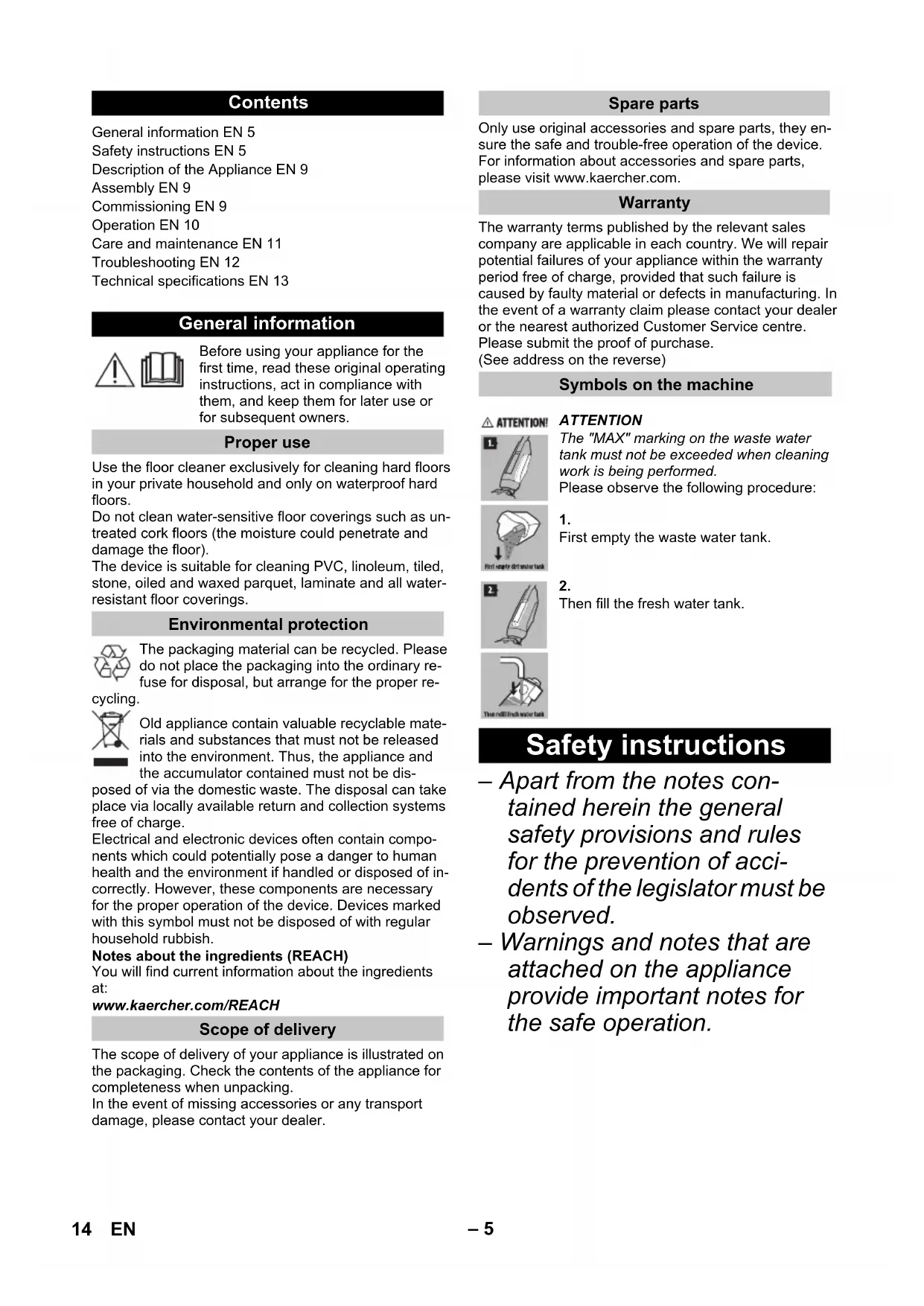 Then fill the fresh water tank. Safety instructions 14 EN– 6 DANGER Pointer to immediate danger, which leads to severe injuries or death. 몇 WARNING Pointer to a possibly dangerous situation, which can lead to se- vere injuries or death. 몇 CAUTION Pointer to a possibly dangerous situation, which can lead to mi- nor injuries. ATTENTION Pointer to a possibly dangerous situation, which can lead to property damage. DANGER Do not immerse the device into water. Check the faultless condition of the appliance and the ac- cessories before using it. Otherwise, the appliance must not be used. Immediately replace the charger with the charging ca- ble in case of visible damage. Turn off the appliance and re- move the mains plug prior to any care and maintenance work. Repair works may only be performed by the authorized customer service. The appliance contains elec- trical components - do not clean under running water. Do not insert conductive ob- jects (such as screwdrivers or the like) into the charging socket. Do not touch contacts or wires. The voltage indicated on the type plate must correspond to the supply voltage. Do not scrape the charger across sharp edges and en- sure that it does not get pressed. 몇 WARNING The appliance may only be connected to an electric sup- ply that has been installed by an electrician in accordance with IEC 60364. The appliance may only be connected to alternating cur- rent. The voltage must corre- spond with the type plate of the appliance. For safety reasons, we rec- ommend that you charge the appliance only via a earth- leakage circuit breaker (max. 30 mA). Hazard levels Electric components 15EN– 7 DANGER Risk of electric shock. Never touch the mains plug and the socket with wet hands. Do not use the charger if dirty or wet. Do not operate the charger in explosive environment. Do not carry the charger by holding the mains cable. Store and use the charger in dry rooms only. Protect the mains cable against heat, sharp edges, oil and moving parts of the ma- chine. Avoid using extension wires with multiple sockets and si- multaneous operation of mul- tiple devices. Do not pull the plug from the socket by pulling the mains cable. Do not cover the charger and keep the air vents of the charger open. Do not open the charger. Get repairs done only by author- ised experts. Use the charger only to charge approved battery packs. Immediately replace the charger with the charging ca- ble in case of visible damage. DANGER Risk of electric shock. Do not expose the battery to direct sunlight, heat or fire. 몇 WARNING Charge the battery with the enclosed original charger or a charger approved by KÄRCHER only. Use the following adaptor: Do not open the battery, as there is a risk of an electrical shock; also, irritating or caus- tic vapors can escape. DANGER The user must use the appli- ance as intended. The person must consider the local condi- tions and must pay attention to other persons in the vicinity when working with the appli- ance. The appliance may not be op- erated in explosive atmos- pheres. If the appliance is used in hazardous areas the corre- sponding safety provisions must be observed. Do not use the appliance if it fell down, is visibly damaged or leaking. Keep packaging films away from children, there is a risk of suffocation! Charger Battery Safe handling PS07 16 EN– 8 몇 WARNING The appliance must not be operated by children or per- sons who have not been in- structed accordingly. This appliance is not intended for use by persons with limit- ed physical, sensory or men- tal capacities or lacking expe- rience and/or skills, unless such persons are accompa- nied and supervised by a per- son in charge of their safety or they have received precise instructions on the use of this appliance and have under- stood the resulting risks. Children must not play with this appliance. Supervise children to prevent them from playing with the appliance. Keep appliance out of reach of children as long as it is switched on or hasn't cooled down. Cleaning and user mainte- nance must not be performed by children without supervi- sion. Operate or store the appli- ance only in accordance with the description or illustration! 몇 CAUTION Create stability for the appli- ance prior to any work on or with the appliance to prevent accidents or damage. Never fill solvents, solvent- containing liquids or undiluted acids (e.g. detergents, petrol, paint thinner, and acetone) into the water reservoir as these substances corrode the materials used in the appli- ance. Never leave the appliance unattended as long as it is in operation. Keep parts of the body (e.g. hair, fingers) away from the rotating cleaning rollers. Keep your hands protected while cleaning the suction head- risk of injury from sharp objects (e.g. splinters). Keep connection cable away from heat, sharp edges, oil and moving parts. ATTENTION Only switch on the appliance when the fresh water tank and waste water tank are fit- ted. The appliance must not be used for the intake of sharp or large objects (e.g. shards, pebbles, toy parts). Do not add acetic acids, des- caling agents, essential oils or similar substances to the fresh water tank. Also ensure that the substances are not drawn in. Only use this appliance on hard floors with waterproof coatings (e. g. varnished par- quet, enamelled tiles, Linole- um). Do not use the appliance for cleaning of carpets or carpet- ed floors. 17EN– 9 Do not use the appliance over the floor grilles of convector heaters. The appliance is not able to take in the water dis- charged when used above grilles. In case of longer breaks in operation and after use, switch off the device at the main switch / device switch and pull the charger’s mains plug. Do not operate the appliance at temperatures below 0 °C. Protect the unit from rain. Do not store outside. Illustrations on the picture pages ** FC 5 Cordless ** FC 5 Cordless Premium Illustration Insert handle into the basic unit as far