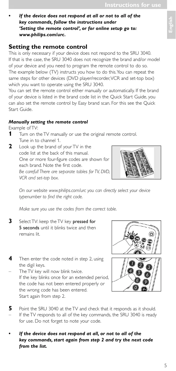 Setting the remote control This is only necessary if your device does not respond to the SRU 3040. If that is the case, the SRU 3040 does not recognize the brand and/or model of your device and you need to program the remote control to do so. The example below (TV) instructs you how to do this.You can repeat the same steps for other devices (DVD player/recorder,VCR and set-top box) which you want to operate using the SRU 3040. You can set the remote control either manually or automatically. If the brand of your device is listed in the brand code list in the Quick Start Guide, you can also set the remote control by Easy brand scan. For this see the Quick Start Guide. Manually setting the remote control Example of TV: 1 Turn on the TV manually or use the original remote control. Tune in to channel 1. 2 Look up the brand of your TV in the code list at the back of this manual. One or more four-figure codes are shown for each brand. Note the first code. Be careful! There are separate tables for TV, DVD, VCR and set-top box. On our website www.philips.com/urc you can directly select your device typenumber to find the right code. Make sure you use the codes from the correct table.