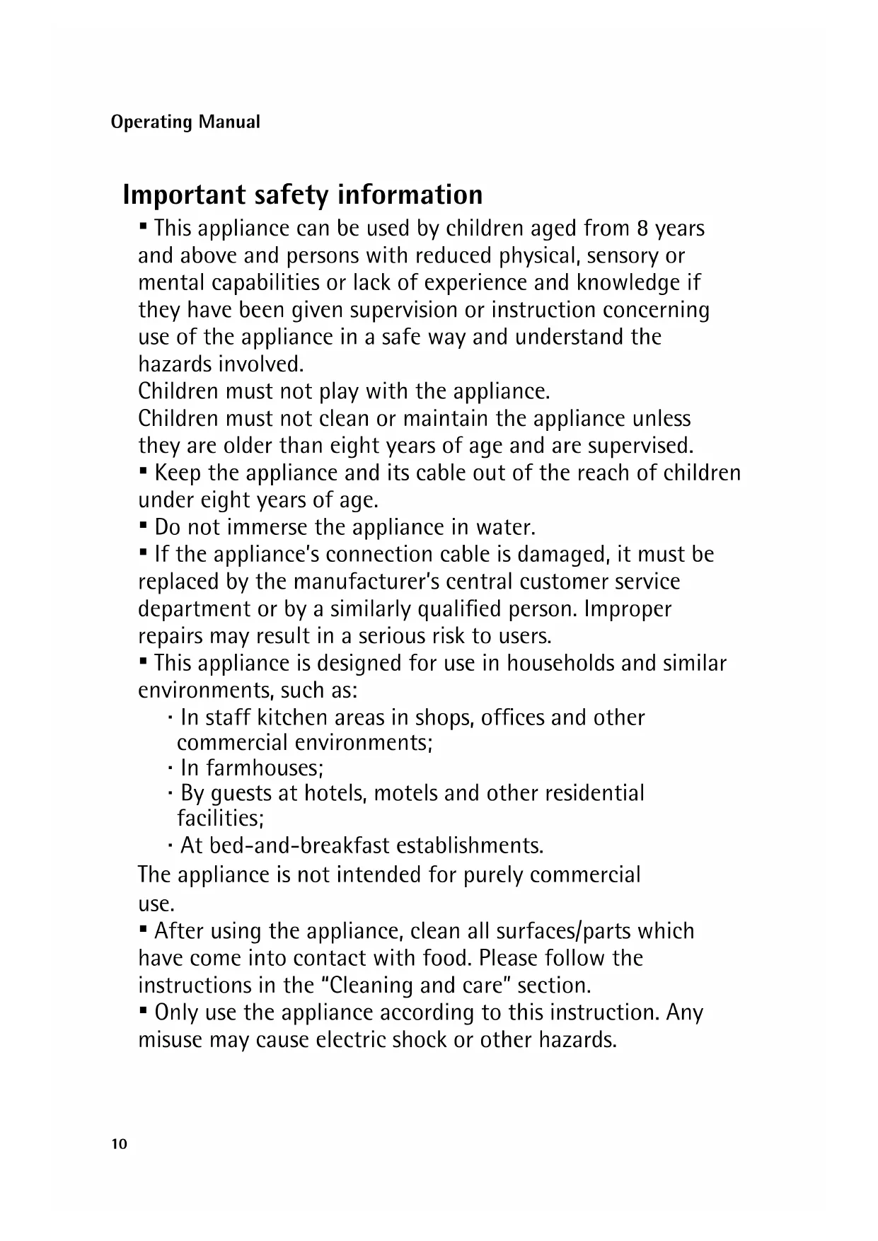 - After using the appliance, clean all surfaces/parts which have come into contact with food. Please follow the instructions in the "Cleaning and care" section.