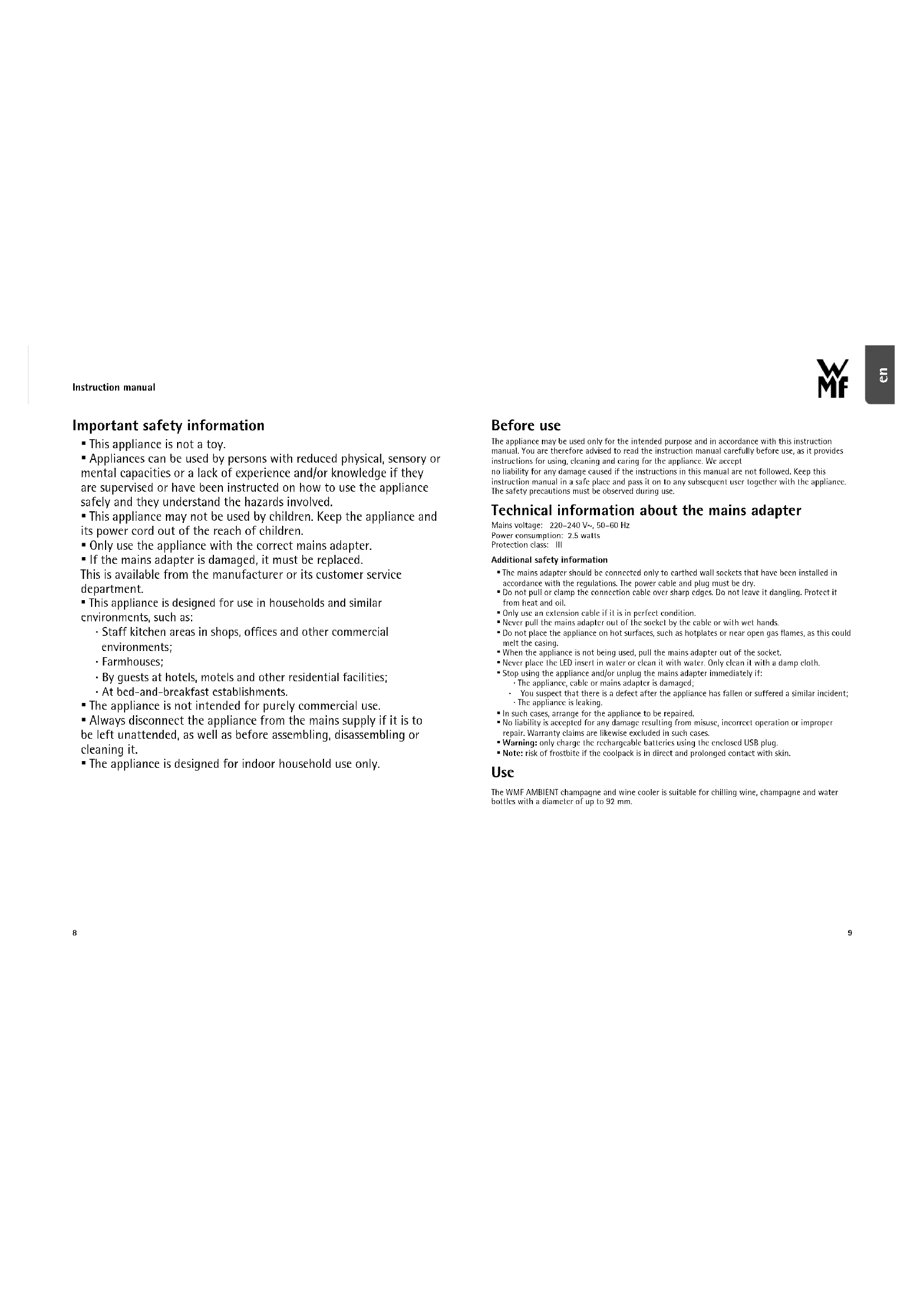- The mains adapter should be connected only to earthed wall sockets that have been installed in accordance with the regulations. The power cable and plug must be dry. ▪ Do not pull or clamp the connection cable over sharp edges. Do not leave it dangling. Protect it from heat and oil. ▪ Only use an extension cable if it is in perfect condition. ▪ Never pull the mains adapter out of the socket by the cable or with wet hands. ▪ Do not place the appliance on hot surfaces, such as hotplates or near open gas flames, as this could melt the casing. ▪ When the appliance is not being used, pull the mains adapter out of the socket. ▪ Never place the LED insert in water or clean it with water. Only clean it with a damp cloth. ▪ Stop using the appliance and/or unplug the mains adapter immediately if: ⋅ The appliance, cable or mains adapter is damaged; ⋅ You suspect that there is a defect after the appliance has fallen or suffered a similar incident; ⋅ The appliance is leaking. ▪ In such cases, arrange for the appliance to be repaired. ▪ No liability is accepted for any damage resulting from misuse, incorrect operation or improper repair. Warranty claims are likewise excluded in such cases. ▪ Warning: only charge the rechargeable batteries using the enclosed USB plug. ▪ Note: risk of frostbite if the coolpack is in direct and prolonged contact with skin. Use The WMF AMBIENT champagne and wine cooler is suitable for chilling wine, champagne and water bottles with a diameter of up to 92 mm. Important safety information
