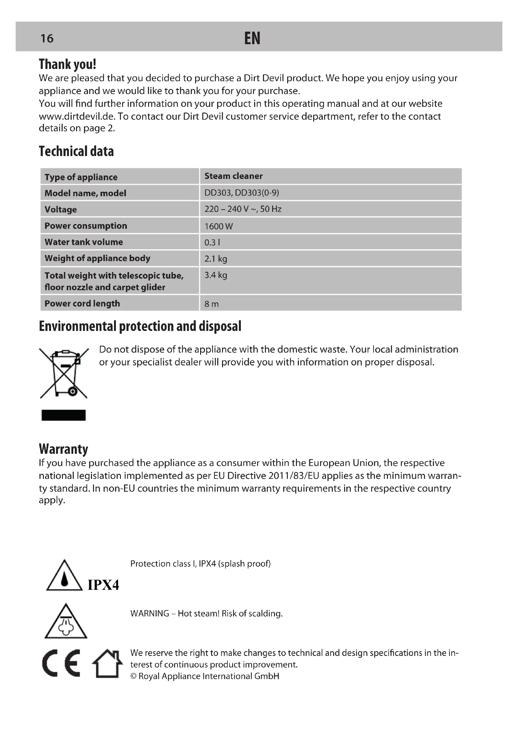 15IPX4 Environmental protection and disposal Do not dispose of the appliance with the domestic waste. Your local administration or your specialist dealer will provide you with information on proper disposal. Warranty If you have purchased the appliance as a consumer within the European Union, the respective national legislation implemented as per EU Directive 2011/83/EU applies as the minimum warran- ty standard. In non-EU countries the minimum warranty requirements in the respective country apply. We reserve the right to make changes to technical and design specications in the in-terest of continuous product improvement.© Royal Appliance International GmbH Thank you! We are pleased that you decided to purchase a Dirt Devil product. We hope you enjoy using your appliance and we would like to thank you for your purchase. You will nd further information on your product in this operating manual and at our website www.dirtdevil.de. To contact our Dirt Devil customer service department, refer to the contact details on page 2. Technical data Type of applianceSteam cleanerModel name, modelDD303, DD303(0-9)Voltage220 – 240 V ~, 50 HzPower consumption1600 WWater tank volume0.3 lWeight of appliance body2.1 kgTotal weight with telescopic tube, oor nozzle and carpet glider3.4 kgPower cord length 8 m WARNING – Hot steam! Risk of scalding.Protection class I, IPX4 (splash proof)