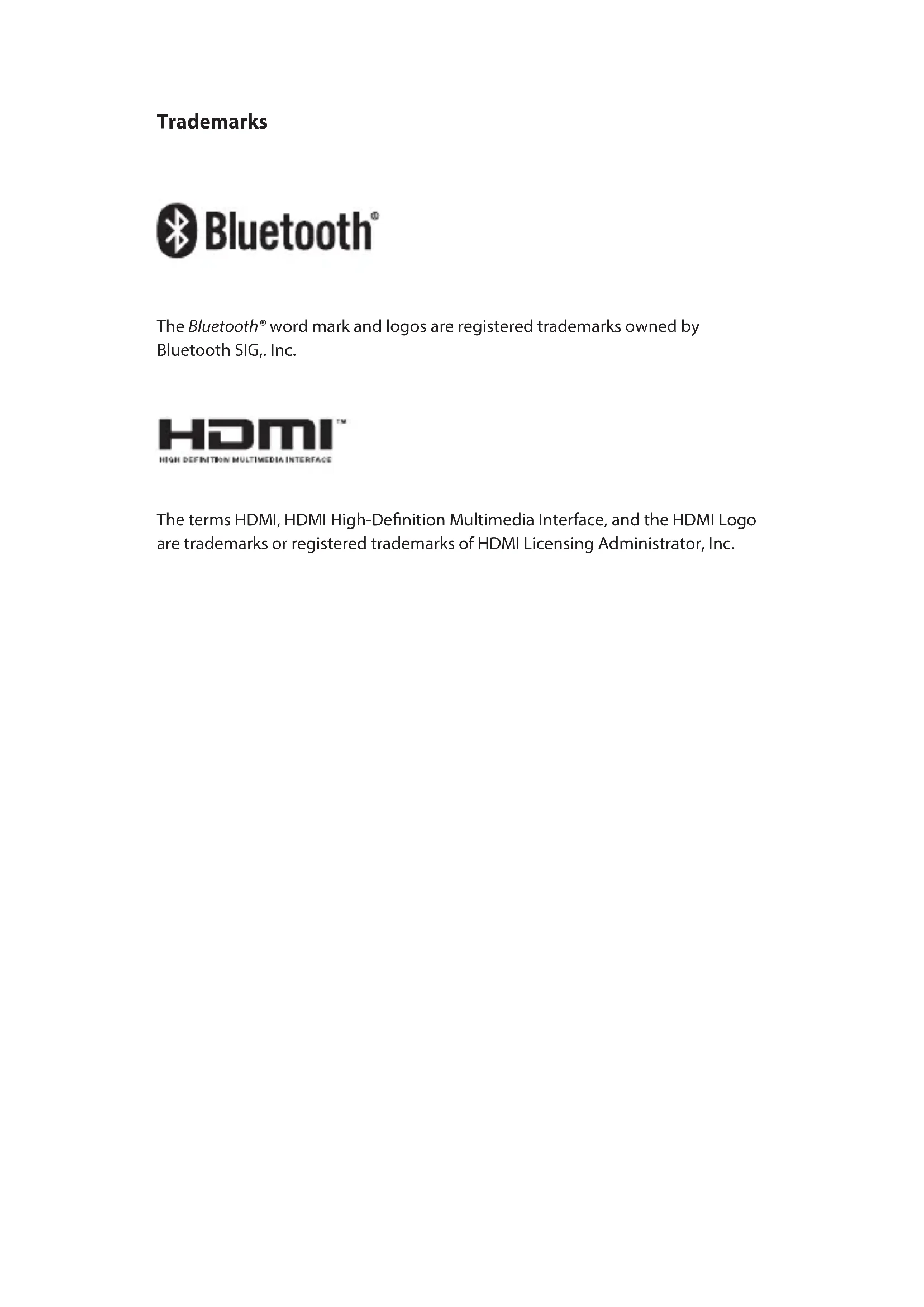 FRESTrademarks The Bluetooth® word mark and logos are registered trademarks owned by Bluetooth SIG,. Inc. The terms HDMI, HDMI High-Denition Multimedia Interface, and the HDMI Logo are trademarks or registered trademarks of HDMI Licensing Administrator, Inc.EN Important safety instructions CAUTION