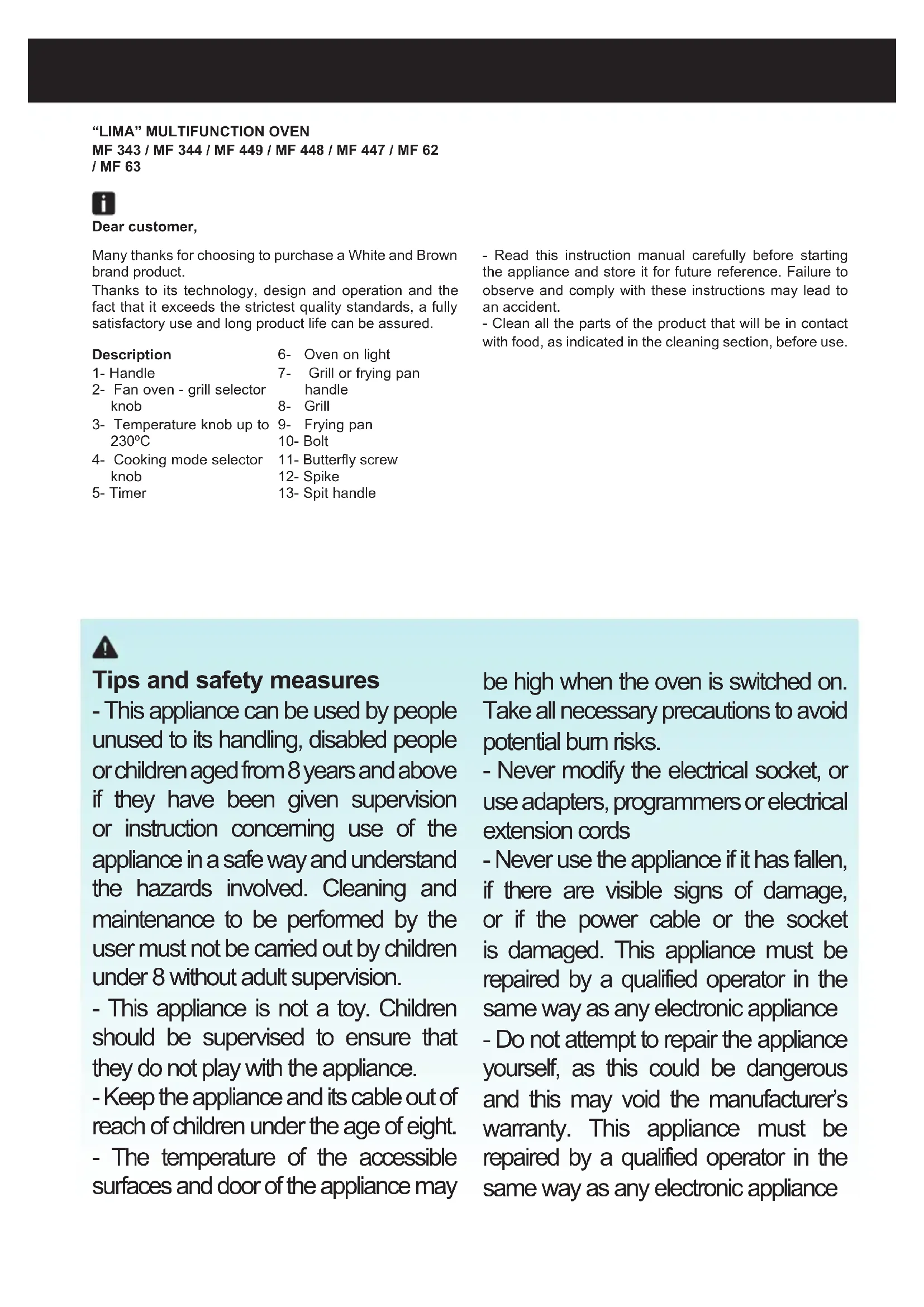 Download the instructions for your Oven in PDF format for free! Find your manual MF449 - WHITE AND BROWN and take your electronic device back in hand. On this page are published all the documents necessary for the use of your device. MF449 by WHITE AND BROWN.