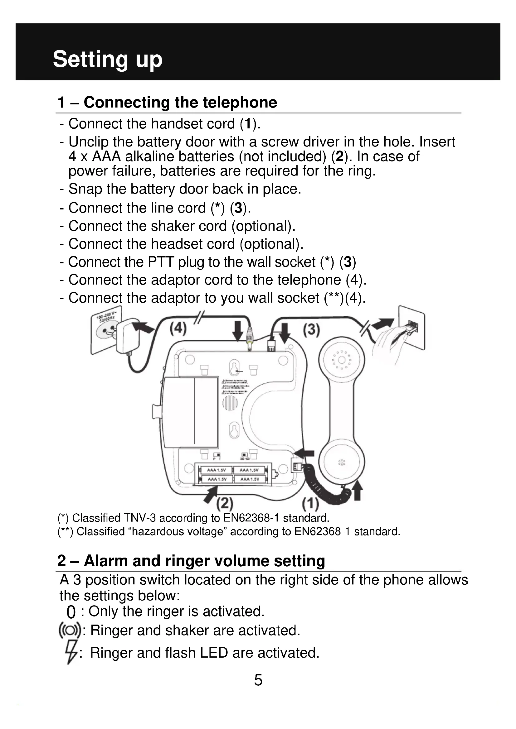 Description5 1 – Connecting the telephone - Connect the handset cord (1). - Unclip the battery door with a screw driver in the hole. Insert 4 x AAA alkaline batteries (not included) (2). In case of power failure, batteries are required for the ring. - Snap the battery door back in place. - Connect the line cord (*) (3). - Connect the shaker cord (optional). - Connect the headset cord (optional). - Connect the PTT plug to the wall socket (*) (3) - Connect the adaptor cord to the telephone (4). - Connect the adaptor to you wall socket (**)(4). (*) Classified TNV-3 according to EN62368-1 standard. (**) Classified “hazardous voltage” according to EN62368-1 standard. 2 – Alarm and ringer volume setting A 3 position switch located on the right side of the phone allows the settings below: