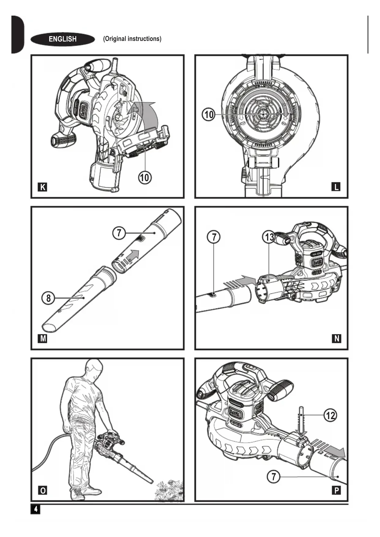Using your product Warning! When using as a blower or vacuum, always wear safety glasses. If using in dusty conditions, wear a lter mask as well. Warning! Switch off your product, allow the fan to stop and remove the plug from the socket before carrying out any adjustment, servicing or maintenance. Assembly Warning! Before assembly, make sure that the appliance is switched off and unplugged. Warning! Always wear protective gloves when working with your blow vac. Vacuum tube assembly (g. A) The vacuum tubes must be assembled together before use. Warning! Do not operate the appliance with the vacuum tubes separated. u To ease assembly, apply a soapy water solution to the joint area. u Align the notches (5a) and the recesses (6a) on the upper (5) and lower (6) vacuum tubes. u Push the lower vacuum tube (6) firmly onto the upper vacuum tube (5) until they click into place. Warning! Do not separate the tubes once assembled. Vacuum mode (g. B, C, D, E, F, G, H, I, J, K, L, M) u Rotate the fan guard assembly anti-clockwise as shown in gure B. u Insert the rod (12) (supplied) into the fan guard release (11) and push upward to release the fan guard assembly (10) as shown in figure C. u Drop the fan guard assembly (10) forward as shown in figure D. u Insert the assembled vacuum tube (5) into the available recess in the power head (4) as shown in figure E. u Insert the collection bag (9) onto the power head (4) as shown in figure E. u Rotate the assembled vacuum tube clockwise so that the bayonet fixing locks into place as shown in figure F. u Place the straps from the collection bag over your shoulder (fig. G) this will support the additional weight as the back pack collection bag fills. u Position the vacuum tube slightly above the debris/leaves. Switch on the appliance by pushing the On/Off switch (1) upwards (fig.G insert) and use a sweeping motion; the debris/leaves will be sucked up the tube, and thrown into the collection bag (9) (fig. G). u To empty the collection bag (9) unzip the rear end and proceed to empty its contents as shown in figure H. u When task is complete, rotate the assembled vacuum tube anticlockwise to release the bayonet fixing. Insert the rod (12) into the fan guard release (11) and push upwards to release the assembled vacuum tube. Remove the assembled vacuum tube from the powerhead as shown in figure J. u Replace the fan guard assembly as shown in figure K. u Rotate the fan guard assembly clockwise as shown in gure L. Blower mode (g. M, N, O, P) u Assemble upper blow tube (7) with lower blow tube (8) as shown in figure M. u Push the assembled blow tube onto the vacuum outlet (13) until the lock engages tightly with the blow tube (fig.N). Warning! Never operate in Blow mode without the blow tube firmly in place.10 ENGLISH (Original instructions)