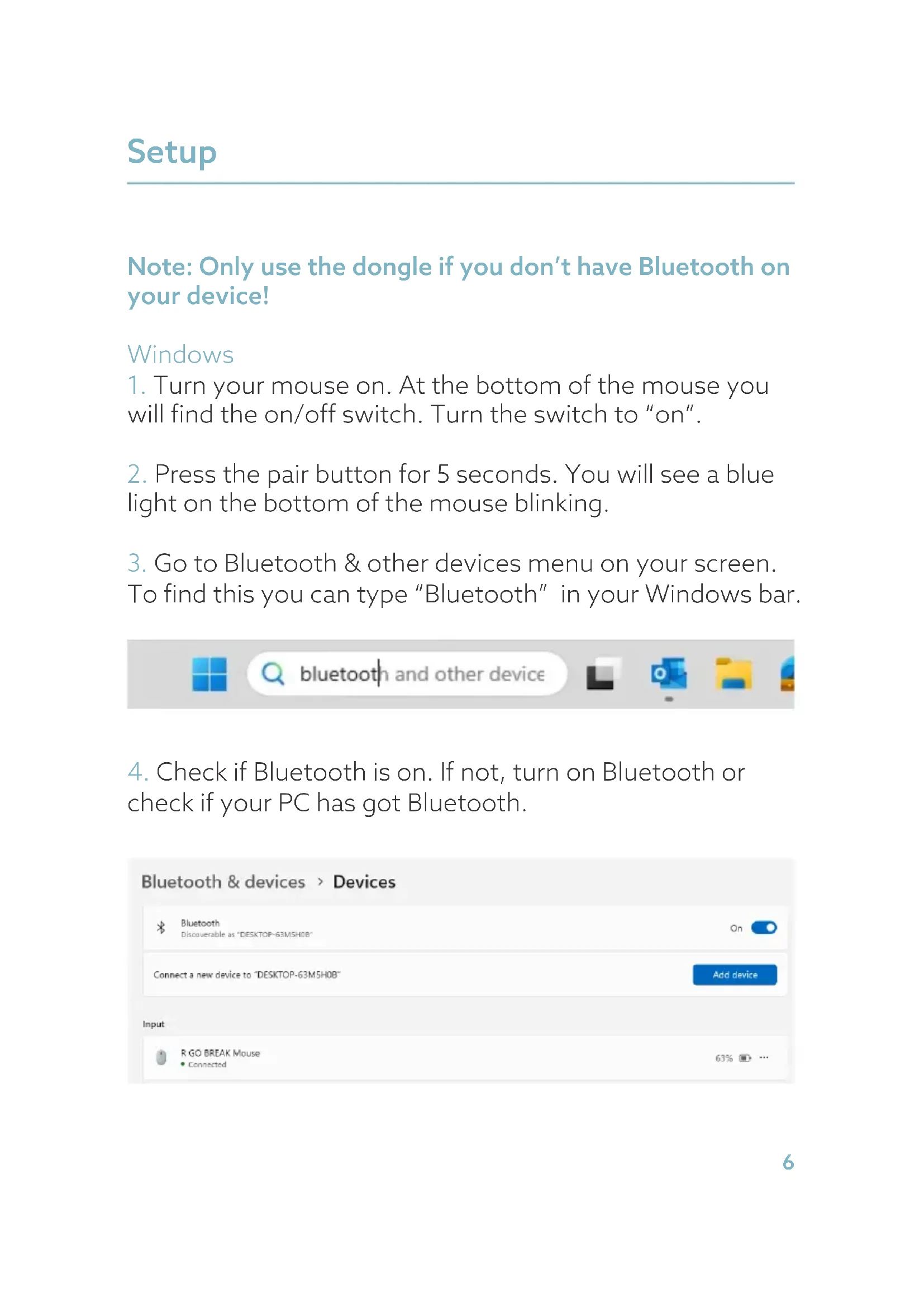 Setup Note: Only use the dongle if you don’t have Bluetooth on your device! Windows