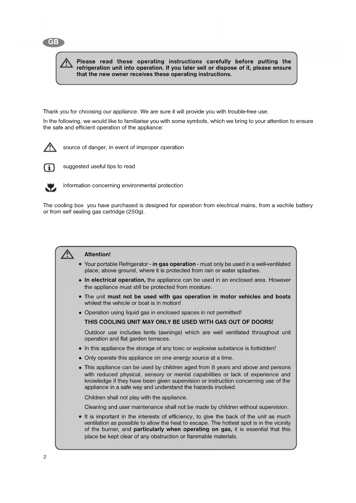 Thank you for choosing our appliance. We are sure it will provide you with trouble-free use. In the following, we would like to familiarise you with some symbols, which we bring to your attention to ensure the safe and efficient operation of the appliance: source of danger, in event of improper operation suggested useful tips to read information concerning environmental protection The cooling box you have purchased is designed for operation from electrical mains, from a vechile battery or from self sealing gas cartridge (250g). Please read these operating instructions carefully before putting the refrigeration unit into operation. If you later sell or dispose of it, please ensure that the new owner receives these operating instructions. Attention! Your portable Refrigerator - in gas operation - must only be used in a well-ventilated place, above ground, where it is protected from rain or water splashes. In electrical operation, the appliance can be used in an enclosed area. However the appliance must still be protected from moisture. The unit must not be used with gas operation in motor vehicles and boats whilest the vehicle or boat is in motion! Operation using liquid gas in enclosed spaces in not permitted! THIS COOLING UNIT MAY ONLY BE USED WITH GAS OUT OF DOORS! Outdoor use includes tents (awnings) which are well ventilated throughout unit operation and flat garden terraces. In this appliance the storage of any toxic or explosive substance is forbidden! Only operate this appliance on one energy source at a time. This appliance can be used by children aged from 8 years and above and persons with reduced physical, sensory or mental capabilities or lack of experience and knowledge if they have been given supervision or instruction concerning use of the appliance in a safe way and understand the hazards involved. Children shall not play with the appliance. Cleaning and user maintenance shall not be made by children without supervision. It is important in the interests of efficiency, to give the back of the unit as much ventilation as possible to allow the heat to escape. The hottest spot is in the vicinity of the burner, and particularly when operating on gas, it is essential that this place be kept clear of any obstruction or flammable materials.3