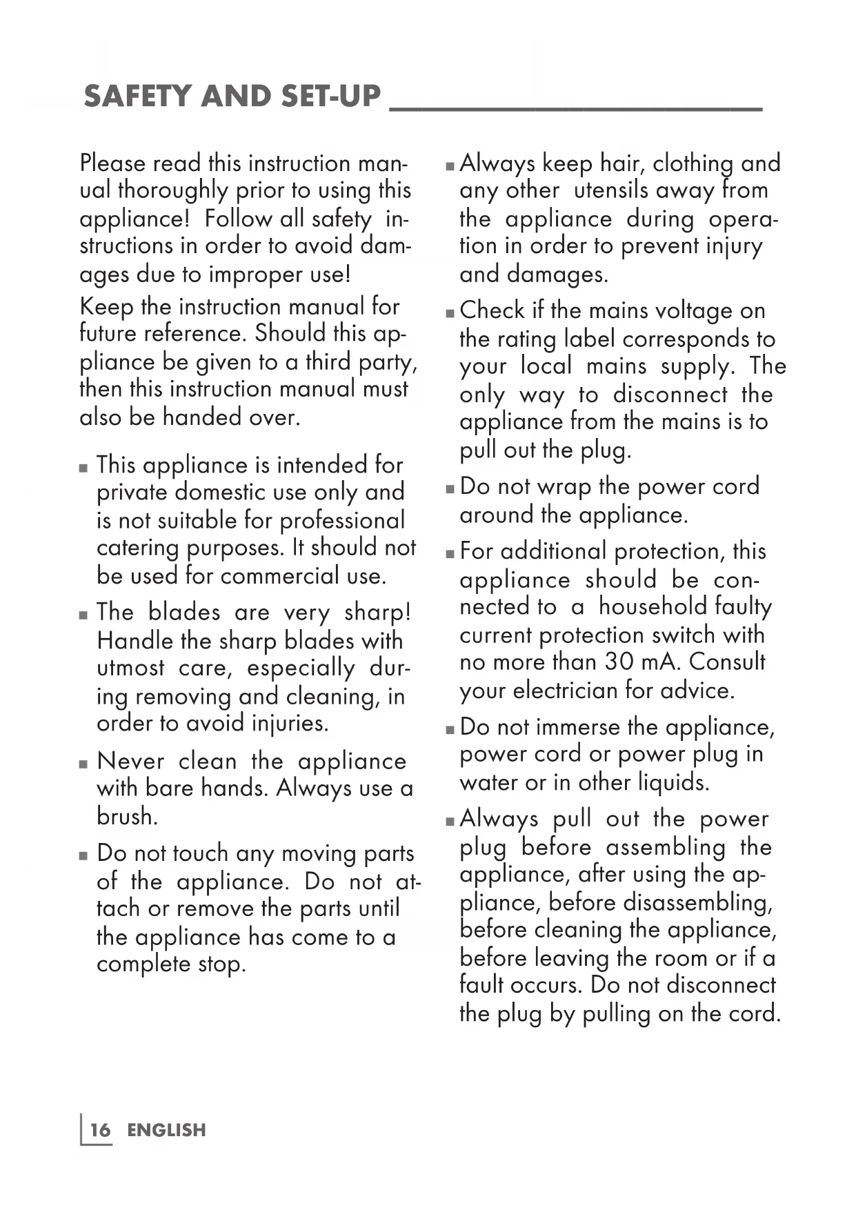 Always pull out the power plug before assembling the appliance, after using the ap- pliance, before disassembling, before cleaning the appliance, before leaving the room or if a fault occurs. Do not disconnect the plug by pulling on the cord.ENGLISH