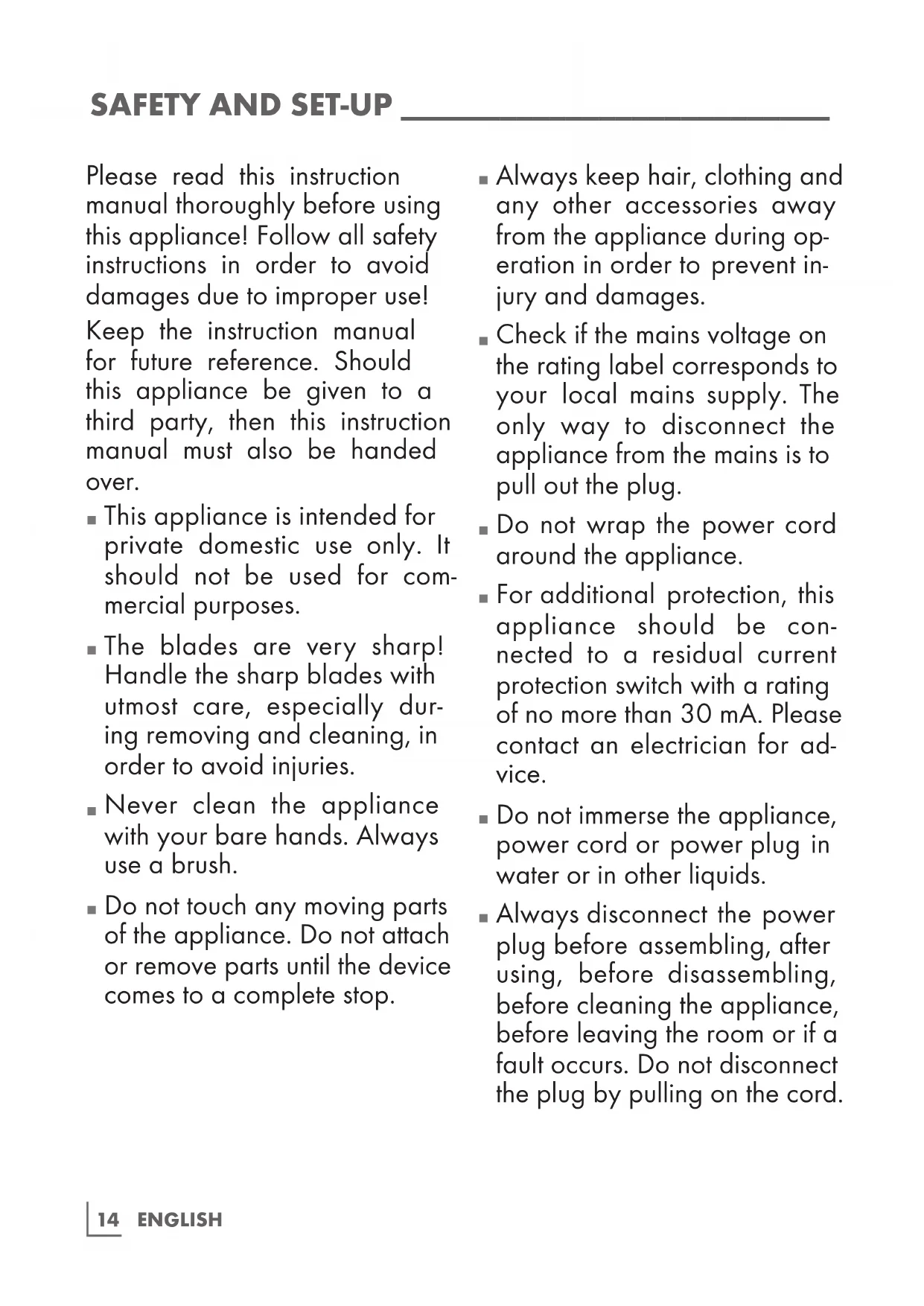 The blades are very sharp! Handle the sharp blades with utmost care, especially dur- ing removing and cleaning, in order to avoid injuries.