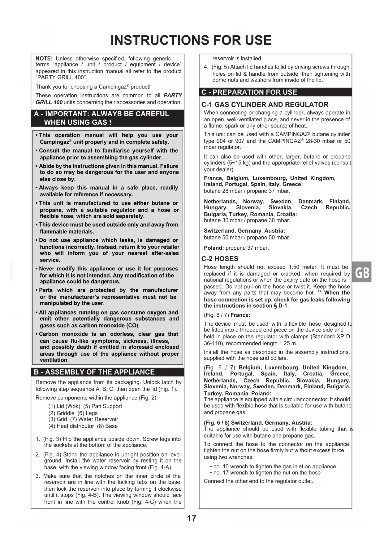 When connecting or changing a cylinder, always operate in an open, well-ventilated place, and never in the presence of a ame, spark or any other source of heat. This unit can be used with a CAMPINGAZ butane cylinder type 904 or 907 and the CAMPINGAZ 28-30 mbar or 50 mbar regulator.It can also be used with other, larger, butane or propane cylinders (5~15 kg) and the appropriate relief valves (consult your dealer): Ireland, Portugal, Spain, Italy, Greece: butane 28 mbar / propane 37 mbar.Netherlands, Norway, Sweden, Denmark, Finland, Hungary, Slovenia, Slovakia, Czech Republic, Bulgaria, Turkey, Romania, Croatia: butane 30 mbar / propane 30 mbar.Switzerland, Germany, Austria: butane 50 mbar / propane 50 mbar.Poland: propane 37 mbar. C-2 HOSES Hose length should not exceed 1.50 meter. It must be replaced if it is damaged or cracked, when required by national regulations or when the expiry date on the hose is passed. Do not pull on the hose or twist it. Keep the hose away from any parts that may become hot. ** When the hose connection is set up, check for gas leaks following the instructions in section § D-1.(Fig. 6 / 7) France:The device must be used with a exible hose designed to be tted into a threaded end piece on the device side and held in place on the regulator with clamps (Standard XP D 36-110), recommended length 1.25 m.Install the hose as described in the assembly instructions, supplied with the hose and collars.(Fig. 6 / 7) Ireland, Portugal, Spain, Italy, Croatia, Greece, Netherlands, Czech Republic, Slovakia, Hungary, Slovenia, Norway, Sweden, Denmark, Finland, Bulgaria, Turkey, Romania, Poland:The appliance is equipped with a circular connector. It should be used with exible hose that is suitable for use with butane and propane gas.(Fig. 6 / 8) Switzerland, Germany, Austria:The appliance should be used with exible tubing that is suitable for use with butane and propane gas.To connect the hose to the connector on the appliance, tighten the nut on the hose rmly but without excess force using two wrenches:• no. 10 wrench to tighten the gas inlet on appliance• no. 17 wrench to tighten the nut on the hoseConnect the other end to the regulator outlet.