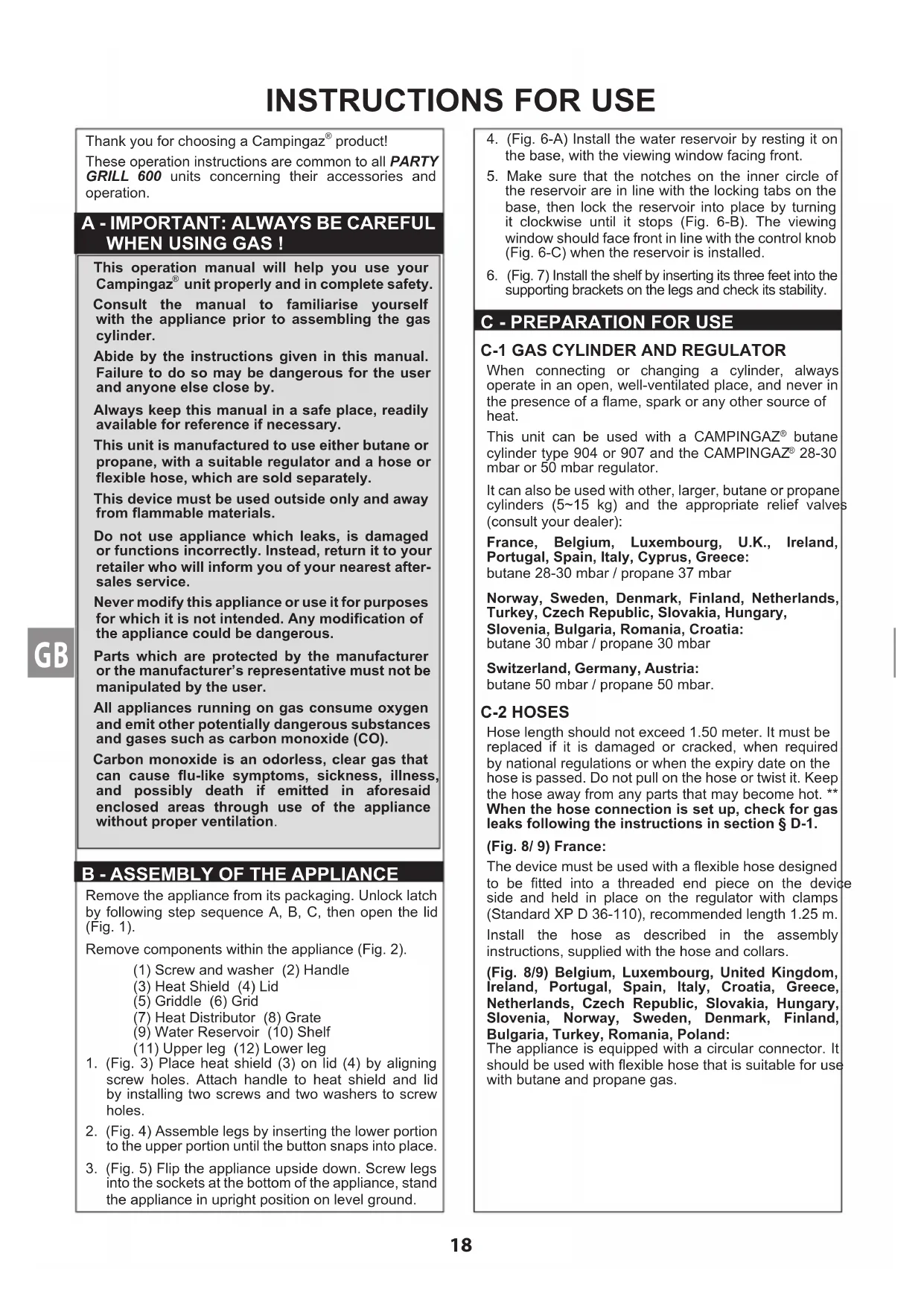 When connecting or changing a cylinder, always operate in an open, well-ventilated place, and never in the presence of a ame, spark or any other source of heat. This unit can be used with a CAMPINGAZ butane cylinder type 904 or 907 and the CAMPINGAZ 28-30 mbar or 50 mbar regulator.It can also be used with other, larger, butane or propane cylinders (5~15 kg) and the appropriate relief valves (consult your dealer):France, Belgium, Luxembourg, U.K., Ireland, Portugal, Spain, Italy, Cyprus, Greece: butane 28-30 mbar / propane 37 mbarNorway, Sweden, Denmark, Finland, Netherlands, Turkey, Czech Republic, Slovakia, Hungary,Slovenia, Bulgaria, Romania, Croatia:butane 30 mbar / propane 30 mbarSwitzerland, Germany, Austria:butane 50 mbar / propane 50 mbar. C-2 HOSES Hose length should not exceed 1.50 meter. It must be replaced if it is damaged or cracked, when required by national regulations or when the expiry date on the hose is passed. Do not pull on the hose or twist it. Keep the hose away from any parts that may become hot. ** When the hose connection is set up, check for gas leaks following the instructions in section § D-1.(Fig. 8/ 9) France:The device must be used with a exible hose designed to be tted into a threaded end piece on the device side and held in place on the regulator with clamps (Standard XP D 36-110), recommended length 1.25 m. Install the hose as described in the assembly instructions, supplied with the hose and collars. (Fig. 8/9) Belgium, Luxembourg, United Kingdom, Ireland, Portugal, Spain, Italy, Croatia, Greece, Netherlands, Czech Republic, Slovakia, Hungary, Slovenia, Norway, Sweden, Denmark, Finland, Bulgaria, Turkey, Romania, Poland:The appliance is equipped with a circular connector. It should be used with exible hose that is suitable for use with butane and propane gas.
