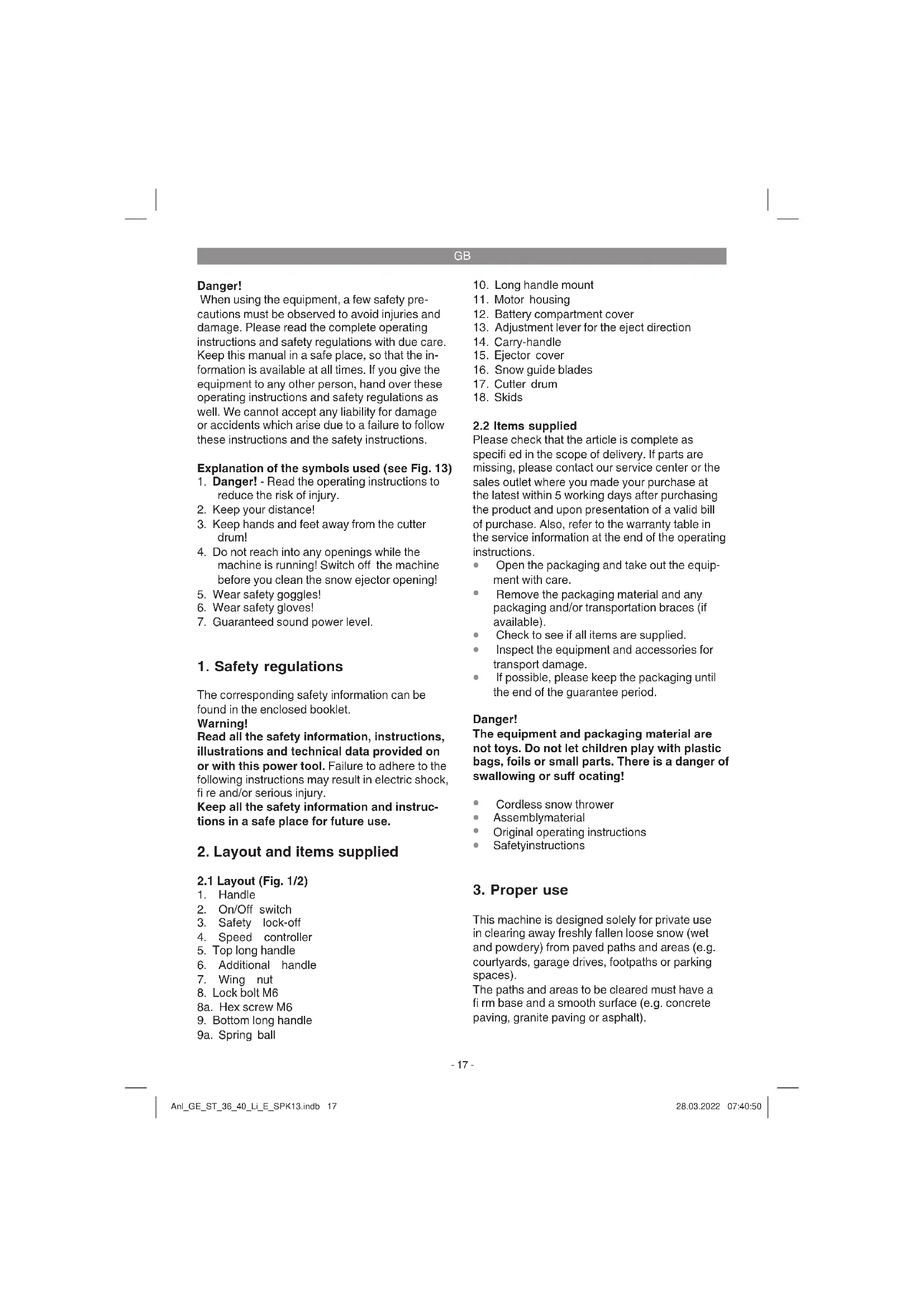 This machine is designed solely for private use in clearing away freshly fallen loose snow (wet and powdery) from paved paths and areas (e.g. courtyards, garage drives, footpaths or parking spaces). The paths and areas to be cleared must have a fi rm base and a smooth surface (e.g. concrete paving, granite paving or asphalt). Anl_GE_ST_36_40_Li_E_SPK13.indb 17Anl_GE_ST_36_40_Li_E_SPK13.indb 17 28.03.2022 07:40:5028.03.2022 07:40:50GB