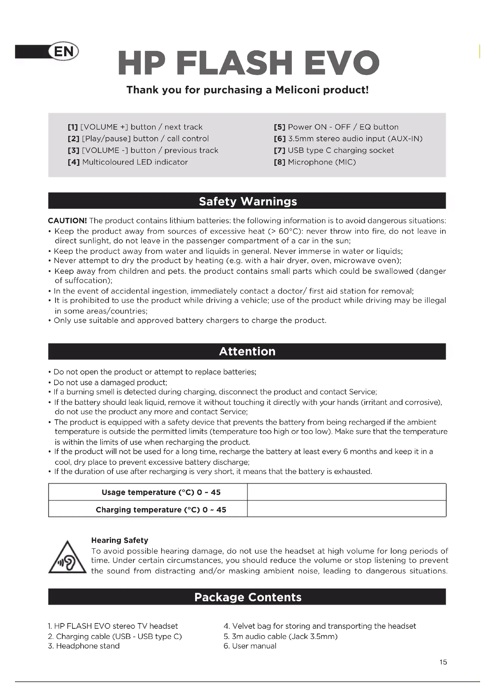 devices simultaneously LED Indicator Light The LED indicator [4] provides a useful indication of the headset's operating status through its colour and flashing mode.18 Technical specifications Driver Size 40mm Speaker Impedance 32Ω Frequency Response 20Hz-20K Hz Bluetooth version V5.3 Frequencies Used 2.400GHz~2.4835 GHz Transmission range up to 10m (open field) Rechargeable Battery 3.7V, 400mAh, 1.48Wh Battery Charging output DC 5V/500mA / PC USB Charging time 2.5 hours Battery Life 22 hours (*Note1) Weight 182g Note1: with new battery, after full charge, Bluetooth® connection, continuous playback at 25°C at medium volume Notes Declaration of Conformity The manufacturer, Meliconi S.p.A., declares that the type of radio equipment, Bluetooth Headset HP Flash EVO, is in conformity with the Directive 2014/53/EU (RED). The full text of the EU Declaration of Conformity is available at the following address: www.meliconi.com/doc/hpflashevo Smaltimento del prodotto The European Directive 2012/19/EU on Waste Electrical and Electronic Equipment (WEEE) requires that this equipment should not be disposed of in the normal municipal solid waste stream, but should be collected separately in order to optimise the recovery and recycling of its constituent materials and to prevent potential damage to health and the environment due to the presence of potentially hazardous substances. The crossed-out bin symbol is displayed on all products as a reminder. The waste can be taken to the appropriate collection centres, or it can be handed over free of charge to the distributor where the equipment was purchased when purchasing a new equivalent. For further information on the correct disposal of these appliances, please contact the relevant public service department. The removal of batteries from the product is the responsibility of the consortium that will dispose of the product. This symbol indicates that the product contains built-in rechargeable batteries subject to European Directive 2013/56/EU and therefore cannot be disposed of with normal household waste. The product must be disposed of at an appropriate collection point or handed over to the retailer.19