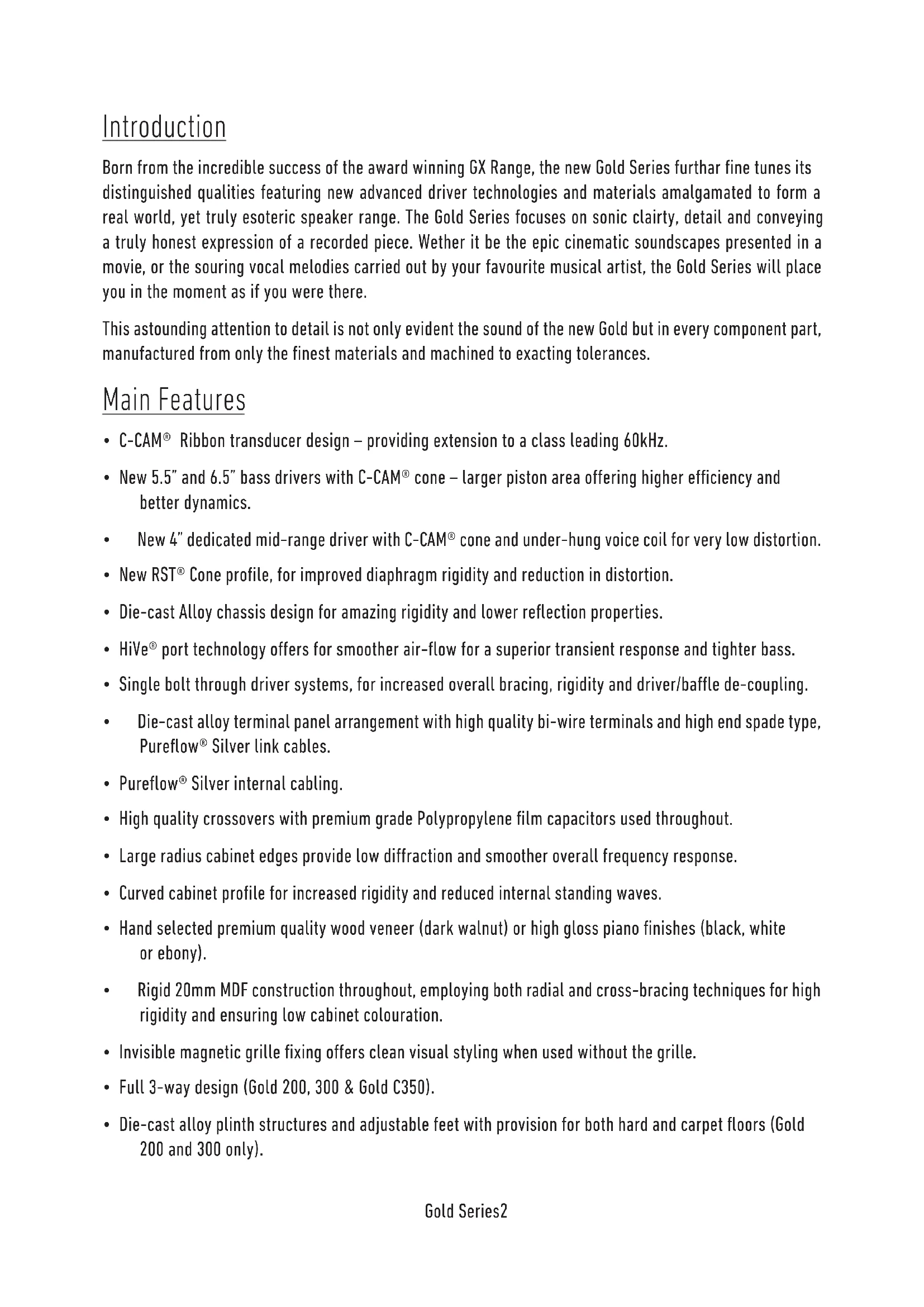 owners manualmonitoraudio.com 1 Contents Introduction 2 Main Features 2 Unpacking 3 Plinth Fixing 3 Spikes and Feet 4 For Wooden/Hard Floors 4 For Carpeted Floors 4 Grilles 4 Setting Up 5 2 Channel Positioning 5 AV Positioning 5 Setting up the Gold FX 6 Fixing the Gold FX to a wall 8 Connecting Speaker Cables 9 Bare Wire Connection 9 Banana Plugs 9 Wiring 9 Single Wiring 9 Bi-Wiring 10 Bi-Amping 10 TheEectsofBi-Wiring/Bi-Amping 10 Port bungs 11 Specications 12 OwnerInformation 13 ENGLISHGold Series2 Introduction Born from the incredible success of the award winning GX Range, the new Gold Series furthar ne tunes its distinguished qualities featuring new advanced driver technologies and materials amalgamated to form a real world, yet truly esoteric speaker range. The Gold Series focuses on sonic clairty, detail and conveying a truly honest expression of a recorded piece. Wether it be the epic cinematic soundscapes presented in a movie, or the souring vocal melodies carried out by your favourite musical artist, the Gold Series will place you in the moment as if you were there. This astounding attention to detail is not only evident the sound of the new Gold but in every component part, manufactured from only the nest materials and machined to exacting tolerances. Main Features