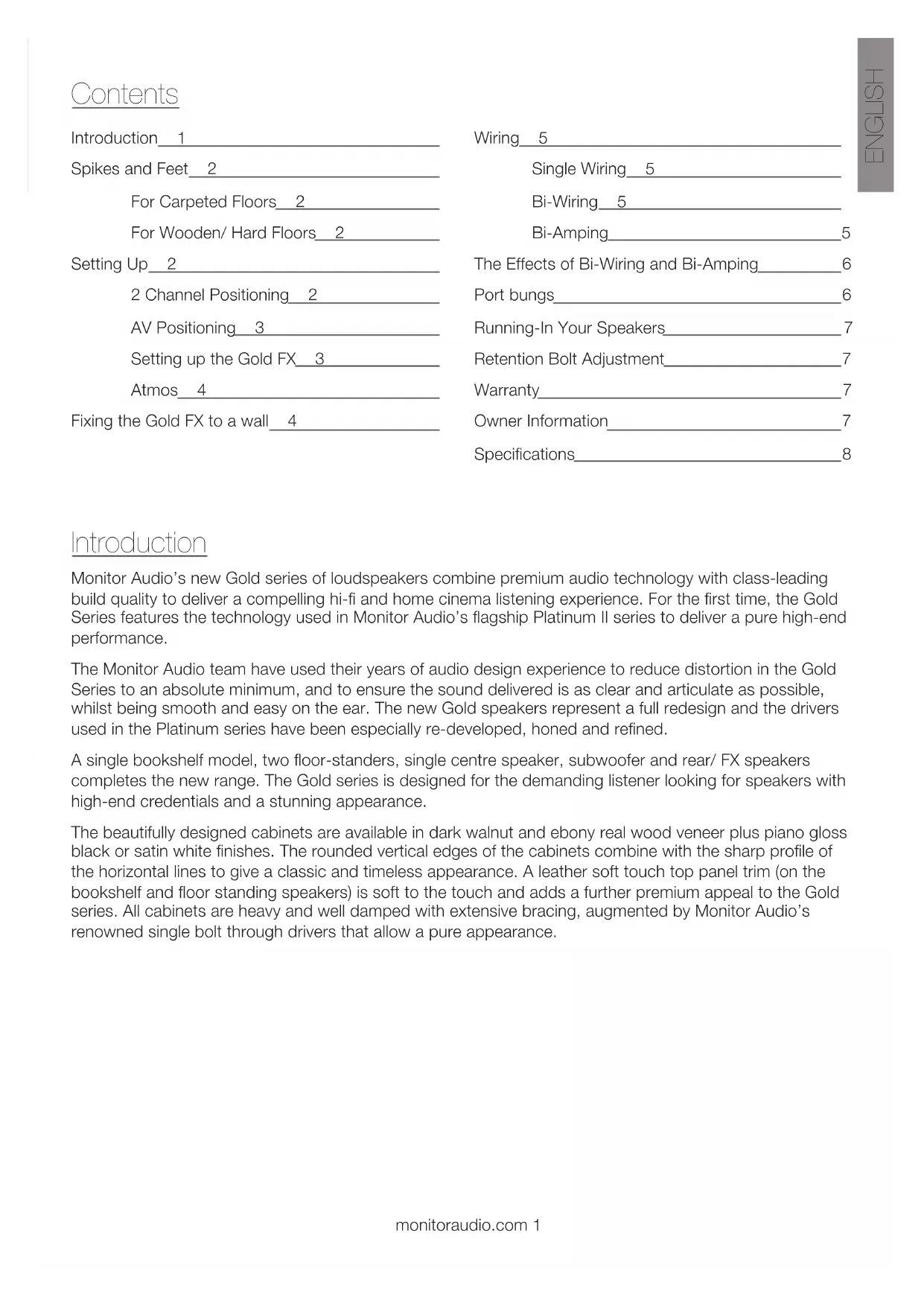 Product ManualEnglish 1 Français 9 Italiano 17 Deutsch 25 Español 33 Português 41 Nederlands 49 中文 57 РУССКИЙ 65 日本語 73 العربية 81 POLSKI 89Contents Introduction Monitor Audio’s new Gold series of loudspeakers combine premium audio technology with class-leading build quality to deliver a compelling hi-fi and home cinema listening experience. For the first time, the Gold Series features the technology used in Monitor Audio’s flagship Platinum II series to deliver a pure high-end performance. The Monitor Audio team have used their years of audio design experience to reduce distortion in the Gold Series to an absolute minimum, and to ensure the sound delivered is as clear and articulate as possible, whilst being smooth and easy on the ear. The new Gold speakers represent a full redesign and the drivers used in the Platinum series have been especially re-developed, honed and refined. A single bookshelf model, two floor-standers, single centre speaker, subwoofer and rear/ FX speakers completes the new range. The Gold series is designed for the demanding listener looking for speakers with high-end credentials and a stunning appearance. The beautifully designed cabinets are available in dark walnut and ebony real wood veneer plus piano gloss black or satin white finishes. The rounded vertical edges of the cabinets combine with the sharp profile of the horizontal lines to give a classic and timeless appearance. A leather soft touch top panel trim (on the bookshelf and floor standing speakers) is soft to the touch and adds a further premium appeal to the Gold series. All cabinets are heavy and well damped with extensive bracing, augmented by Monitor Audio’s renowned single bolt through drivers that allow a pure appearance. monitoraudio.com 1 ENGLISH Introduction 1 Spikes and Feet 2 For Carpeted Floors 2 For Wooden/ Hard Floors 2 Setting Up 2 2 Channel Positioning 2 AV Positioning 3 Setting up the Gold FX 3 Atmos 4 Fixing the Gold FX to a wall 4 Wiring 5 Single Wiring 5 Bi-Wiring 5 Bi-Amping 5 The Effects of Bi-Wiring and Bi-Amping 6 Port bungs 6 Running-In Your Speakers 7 Retention Bolt Adjustment 7 Warranty 7 Owner Information 7 Specifications 8Spikes and Feet For Carpeted Floors (Gold 200 and 300 only) The feet and ‘out-riggers’ are supplied assembled for use on carpeted floors or where spikes are appropriate. All that is required is to fix them to the speaker base using the supplied bolts (A & B). You can check that the speaker is level on all sides by using the spirit level. If it’s slightly off-level, unscrew the foot at the lowest point and check again. Continue this process until the cabinet is fully level. Use the locking nuts on each foot to fix the feet in place and to stop any unwanted vibrations. Please ensure there are no hidden wires under the carpet that could be damaged by the spikes. For Wooden/ Hard Floors (Gold 200 and 300 only) Remove the spikes and fix the feet and ‘out-riggers’ to the speaker base using the supplied bolts (A & B). You can check that the speaker is level on all sides by using a spirit level. If it’s slightly off-level, unscrew the foot at the lowest point and check again. Continue this process until the cabinet is fully level. Use the locking nuts on each foot to fix the feet in place and to stop any unwanted vibrations. Setting Up 2 Channel Positioning When arranging a 2 channel system, the listening position and the loudspeakers should form an equilateral triangle. The speakers should be positioned approximately 6 - 10 feet (1.8 - 3m) apart. The ideal distance from the rear wall varies depending on the speaker (see list below), however, for optimal performance they need to be a minimum of 3 feet (91cm) from the side walls.