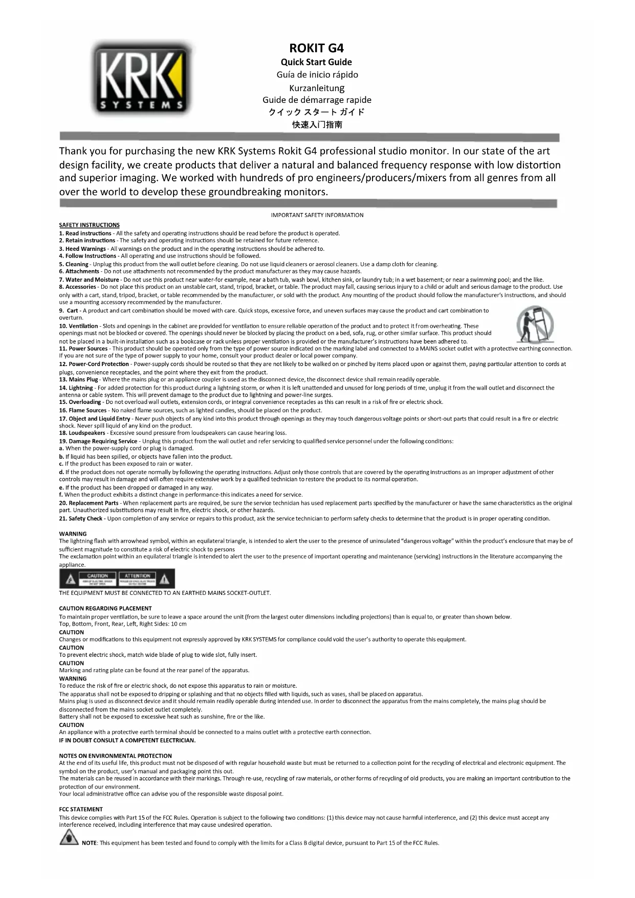 At the end of its useful life, this product must not be disposed of with regular household waste but must be returned to a collection point for the recycling of electrical and electronic equipment. The symbol on the product, user’s manual and packaging point this out. The materials can be reused in accordance with their markings. Through re-use, recycling of raw materials, or other forms of recycling of old products, you are making an important contribution to the protection of our environment. Your local administrative office can advise you of the responsible waste disposal point. FCC STATEMENT This device complies with Part 15 of the FCC Rules. Operation is subject to the following two conditions: (1) this device may not cause harmful interference, and (2) this device must accept any interference received, including interference that may cause undesired operation. NOTE: This equipment has been tested and found to comply with the limits for a Class B digital device, pursuant to Part 15 of the FCC Rules.Quick Start Guide It IS ROKIT science. For more in-depth information about your ROKIT G4 monitors go to www.krksys.com and download the full manual and spec sheets. There you’ll find all the information needed to help you make the most of your new monitors now and in all your future projects.