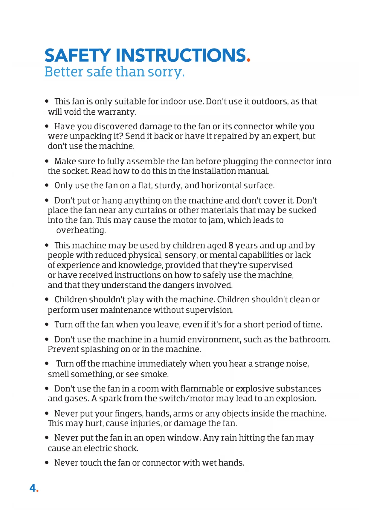 - is fan is only suitable for indoor use. Don’t use it outdoors, as that will void the warranty.