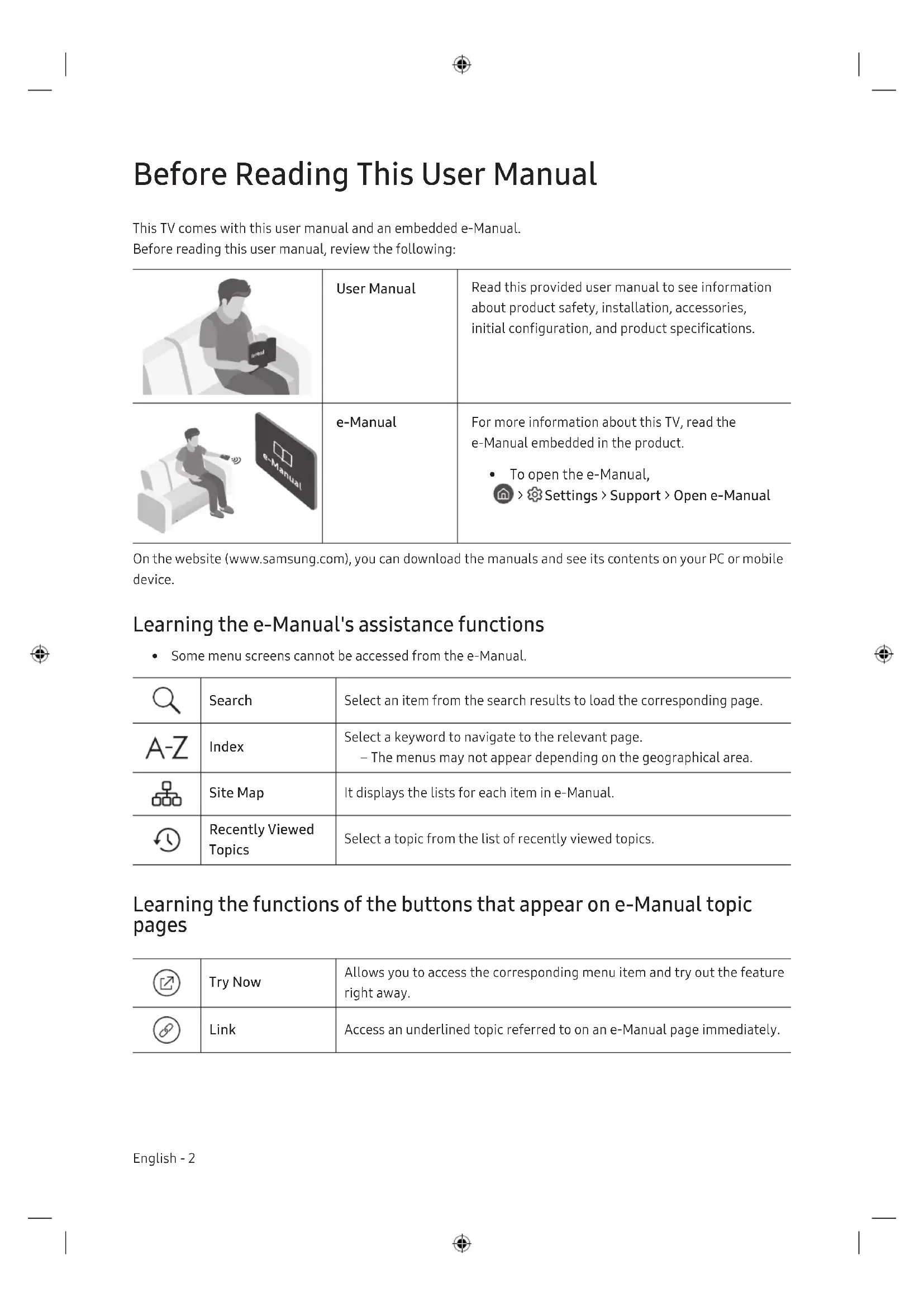 - To open the e-Manual, > Settings > Support > Open e-Manual On the website (www.samsung.com), you can download the manuals and see its contents on your PC or mobile device. Learning the e-Manual's assistance functions