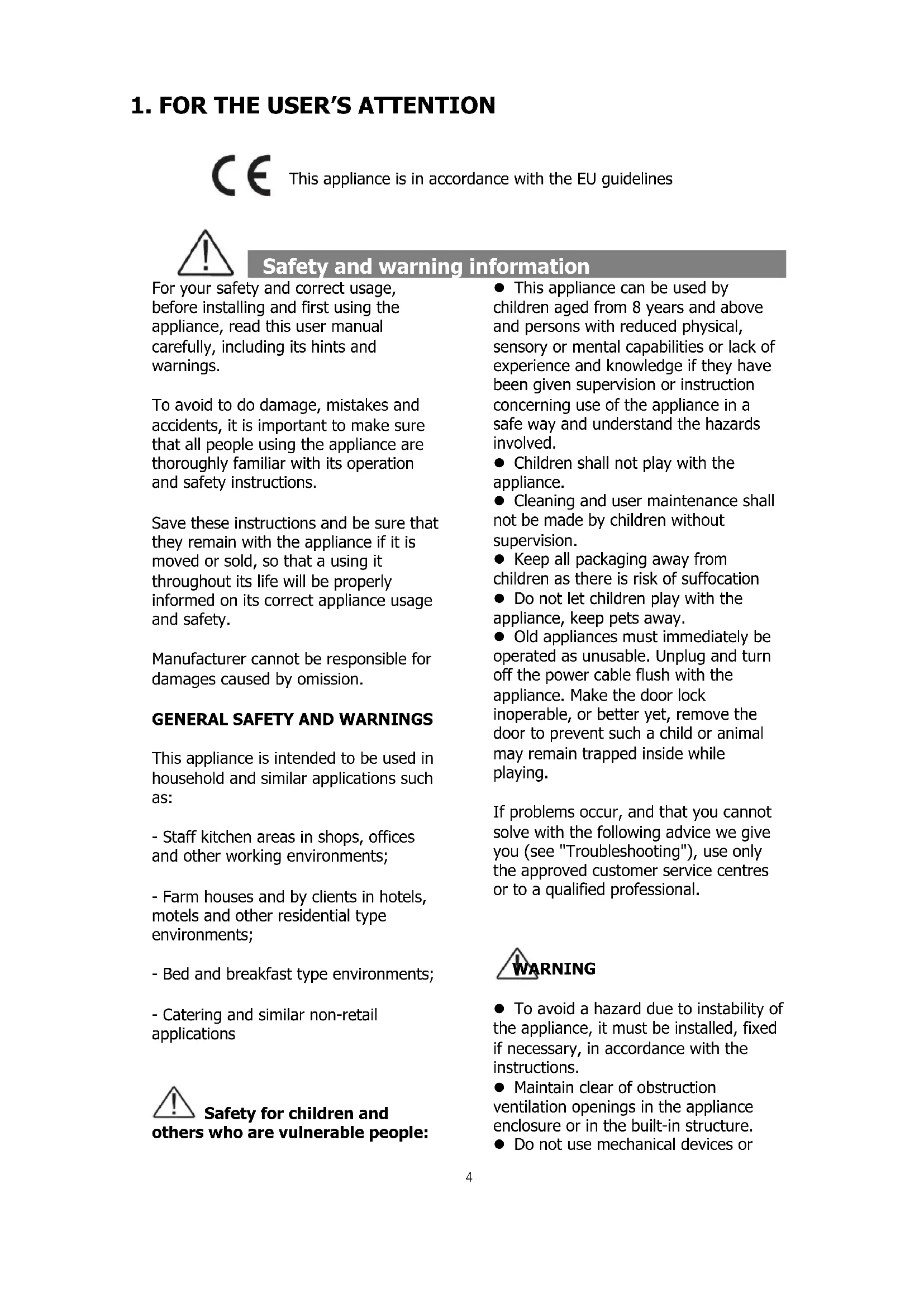 This appliance is in accordance with the EU guidelines Safety and warning information For your safety and correct usage, before installing and first using the appliance, read this user manual carefully, including its hints and warnings. To avoid to do damage, mistakes and accidents, it is important to make sure that all people using the appliance are thoroughly familiar with its operation and safety instructions. Save these instructions and be sure that they remain with the appliance if it is moved or sold, so that a using it throughout its life will be properly informed on its correct appliance usage and safety. Manufacturer cannot be responsible for damages caused by omission.
