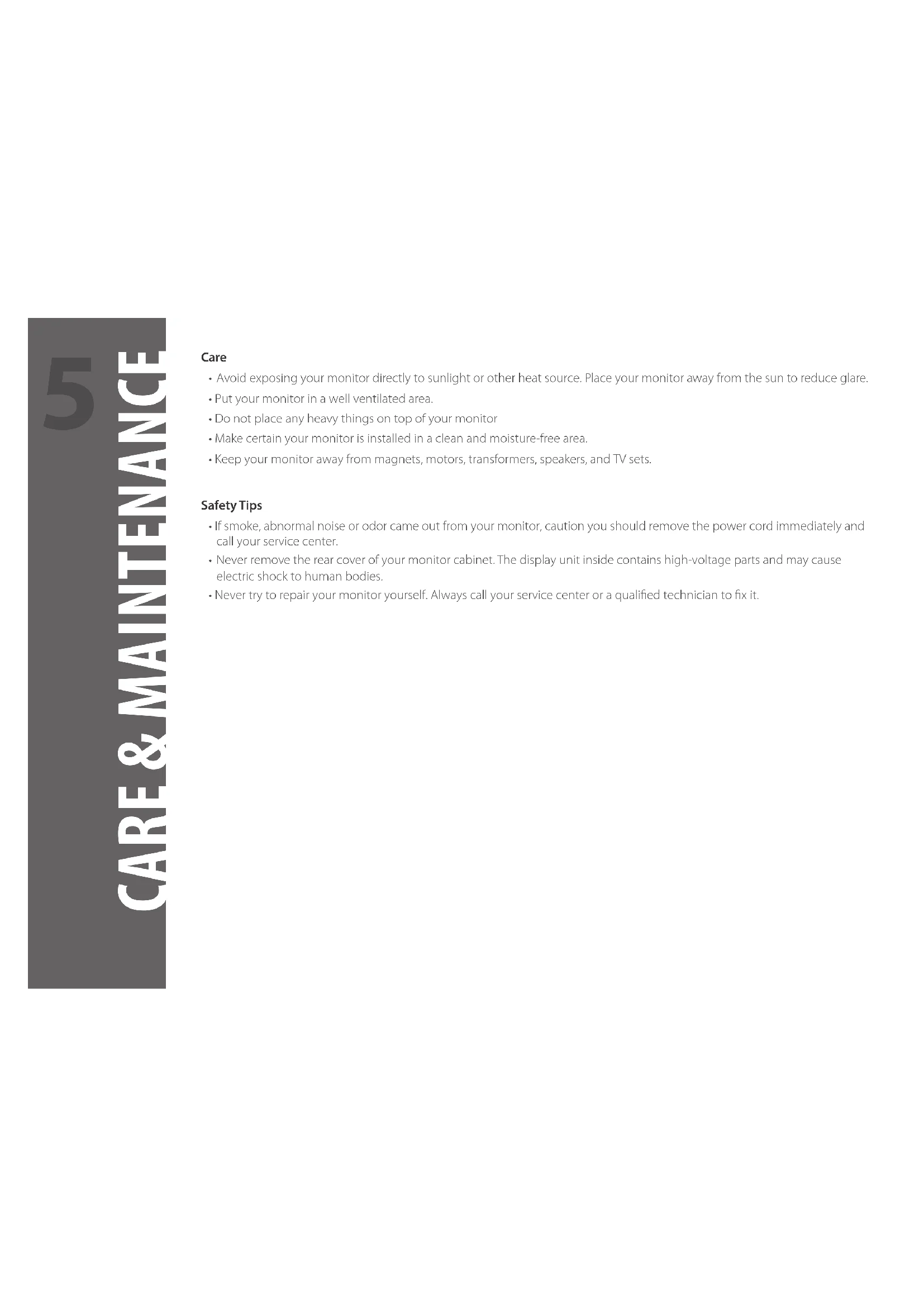 - Keep your monitor away from magnets, motors, transformers, speakers, and TV sets. Safety Tips