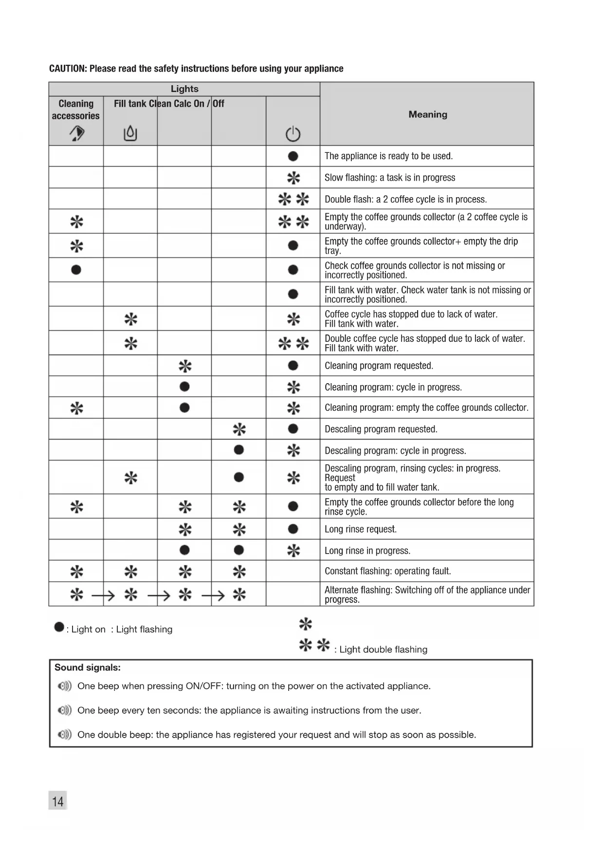 Warning against the risk of serious or fatal injuries. The lightning bolt symbol warns against electrical dangers. Attention : Warning against the risks of incorrect operation, damage or destruction of the appliance. Important : General or important note on the operation of the appliance. Warning signals Empty the coffee grounds collector and the drip tray, and wipe clean the area where the coffee drawer sits; the light will remain on if the coffee grounds collector is not properly inserted or if it has been put back in place 4 seconds earlier. Fill water tank Coffee bean grinding neness setting CLEAN Proceed with cleaning Standard Strong coffee CALC Proceed with scale removal Steam button CLEAN + CALC Carry out a long rinse Rinsing/servicing16 BEVERAGE PREPARATION TYPES OF COFFEE Number of cups possible Possible volume settings (ml) Possible strength settings RISTRETTO 1 20 to 30 ml